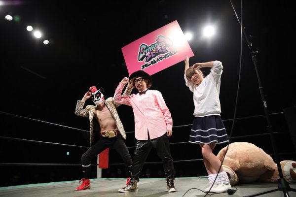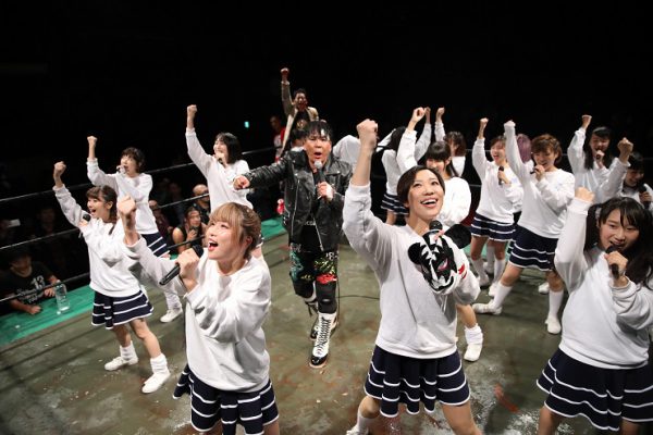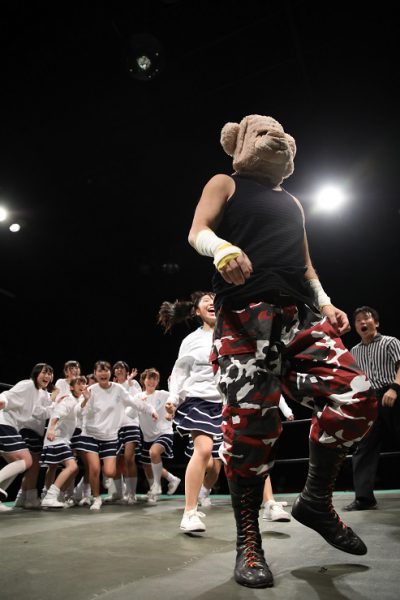 スターダム★アイドルズのメンバー15名が総登場、太仁田厚の登場から急きょ試合は2vs15に。メンバーたちは太仁田に「きもい!」と悲鳴。傷ついた太仁田がカバーされると3カウント。太仁田は速攻退場となった。メンバーたちはクマをコーナーに追い込み次々と串刺し攻撃を浴びせていく。しかし、なかにはキックが完全に空振りする選手も。全員で殴りかかりストンピングを食らわすとクマが怒って立ち上がる。全員がリングを下りるとレフェリーはリングアウトを宣告。事実上の試合放棄か…。メンバーたちは「全然ダメじゃん私たち」「もっと応援してもらわないと」「みんなリングの下におりてアピールするよ!」。するとメンバーたちは場外に出て歌い出す。「みなさん応援よろしくお願いします、プ~~ッス!」