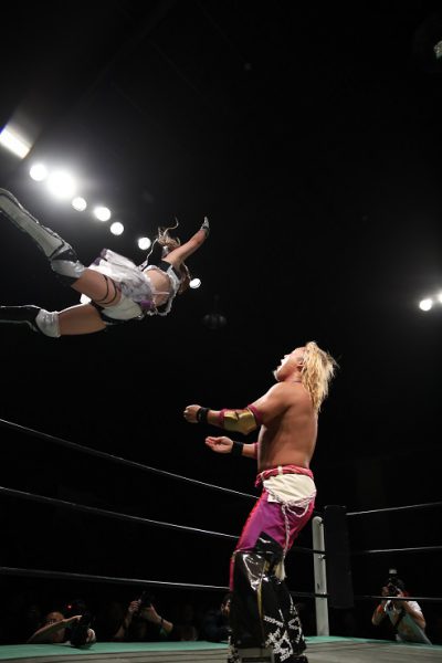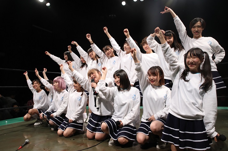 「一言で言うと、一言では言えないんですけど、おもちゃ箱をひっくり返したその上で、エリートもニートも引きこもりも、バカも天才もいろんな人が、ただそこに存在できるような全部が許されるような場所を作りたいって旗揚げを決めたときに言ってたんですけど、その第一歩になったんじゃないかなと思います。まったくホントにまだまだ体もできてないですし、プロレスの練習もしていない女の子たちが14人デビューしました。ここからどうなっていくのかっていうストーリーを今日見に来ていただいたみなさんに、一緒に夢を追いかけていただきたいなという気持ちです。自分はGMっていう立場だけど、私もまだまだ夢を追いかけている途中で、私すごくいろんなことを人生の中であきらめてきたんですよ。すごい挫折ばかりの人生でアイドルっていうものについても私は、3年前までアイドルやってたんですけど、あきらめた夢だったんですね。ホントに心が折れて挫折して2度と戻らないと思ったんですけど、それに架け橋をかけてくれたのがプロレス。この二つが一緒になったらきっとすごいパワーを発揮できるなって私はホントに信じてて。今日14人プラスひとり補欠のアイドルズの方のメンバーといろんな人の力を借りてそれがちょっと確信、モヤモヤとしたものが少しだけハッキリ見えたのかなって思います」