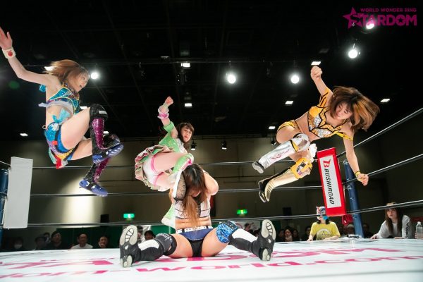 岩谷は詩美へスクールボーイからのスライディングニーアタック。ここで桃と小野崎が2人で岩谷に襲いかかるも、岩谷は二人の腕を取ってロープでバウンドしながらアームドラッグ。そして星輝とともに2人でランニングニーの競演を見せ、岩谷がダブルリストアームサルトで詩美を投げきってから星輝にタッチ。