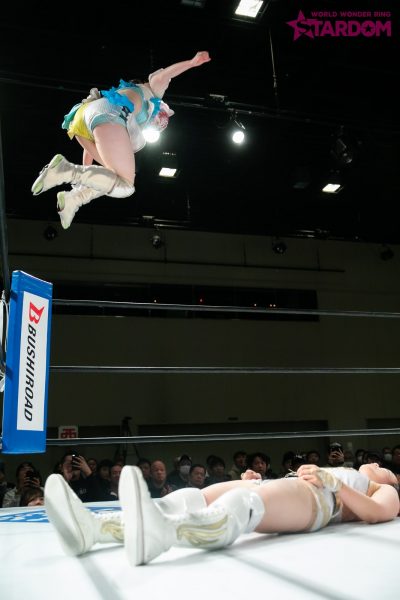 AZMがブレイクするとレイラはバックドロップを狙うが、これを振り払ったAZMがハイキックを叩き込んでロープに飛ぶ。レイラがカウンターのラリアットを叩き込むとAZMが交通事故のように宙に舞い、さらにレイラがオリンピックスラムで叩きつけるもカウントは2。続けてレイラがジャーマン・スープレックスを狙うとAZMはカサドーラの体勢からあずみ寿司。これを返されるとさらにハイキックを叩き込んでいくが、レイラはこれを耐えきってジャーマン・スープレックスで叩きつけ、素早くコーナーに飛び乗って三角飛び式ムーンサルトプレス。これが決まり手となり、レイラがハイスピードGP2連勝のロケットスタートを決めた。