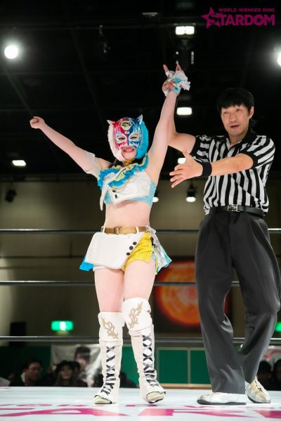 上谷「自分はスターダムの顔である麻優さんとありささんと一緒にタッグを組ませていただいて、メインで試合をさせていただけて本当に勉強になりました。これからもっともっと自分は成長していって、フューチャーのベルトが目標なので、その目標に向かって頑張っていきたいと思います!」