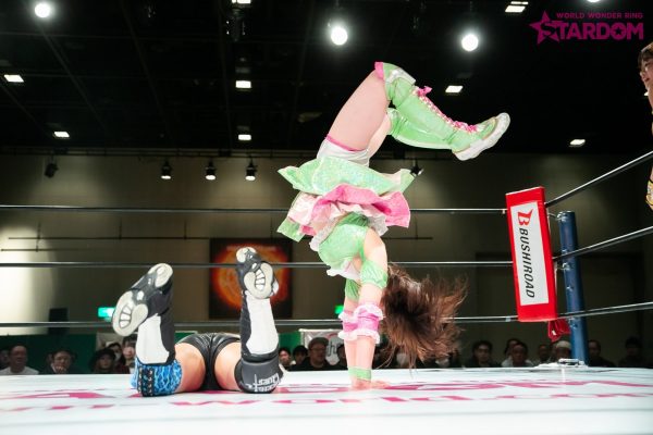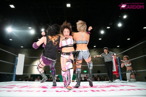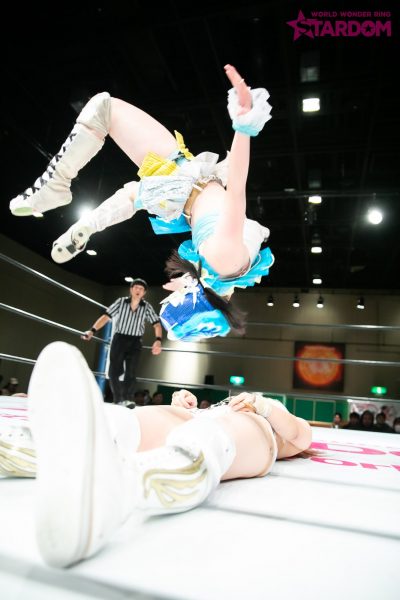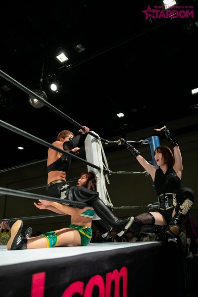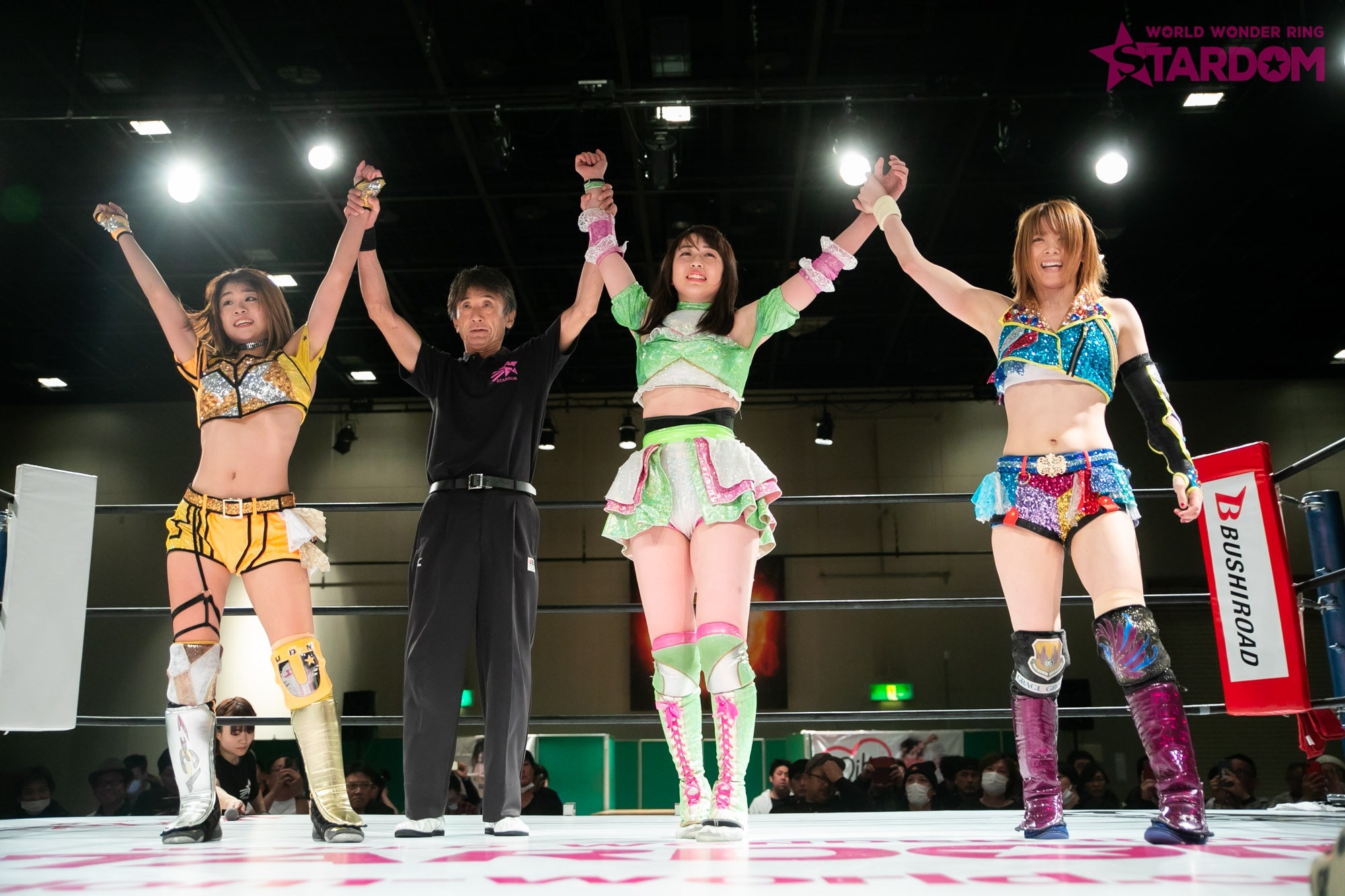 清水大会のオープニングでは、恒例となった小坂井ゆりえリングアナ&星野唯月&上谷沙弥によるTRY☆ANGLEによるライブが行われ、『未来のスターダム』を披露。