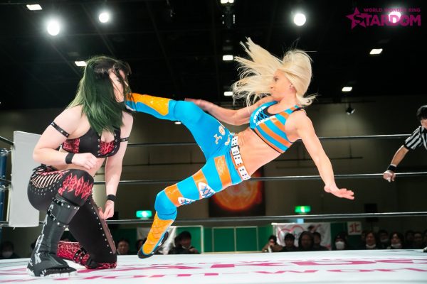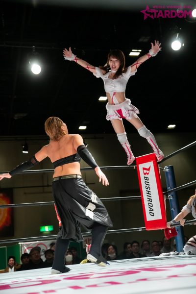刀羅ナツコ、夏すみれがインフルエンザで欠場となったことで既報カードに変更が生じ、急遽実現したキッドvs星野という未来のハイスピード戦線を彩ることが期待される両者のシングルマッチ。