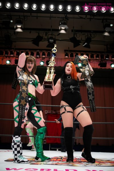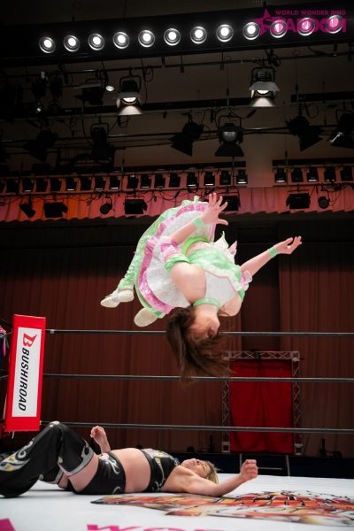 桃組が突っかかる形で試合がスタート。場外に出ると王者組が一気に優位に立つ。挟み撃ちにするとリングサイドを駆け回ってハイタッチ。リングに戻っても王者組の優勢がつづく。プレストリーが桃を捕獲し控えの詩美を場外に落とす。自軍コーナーで孤立させると早いタッチワークで交互に攻めていく。ヘイターが桃にボディースラムからコーナーに追い込み顔面を踏みつけていく。ようやく桃がミサイルキックを放ち詩美に託す。詩美はプレストリーを担ぎ上げてヘイターに叩きつける。詩美がヘイターにミサイルキック。詩美が突進するとヘイターが受け止めてコーナーに投げつける。さらに串刺しエルボーの連打。詩美が返すとヘイターが左右のニーを連打。詩美がダッシュするとヘイターがバックブリーカーからブレーンバスター。プレストリーが蹴りにいくが詩美が連続でかわしていく。詩美がプレストリーをかわしてラリアットを反対に叩きつける。桃がプレストリーに串刺しドロップキック、串刺しミドルの連打からドロップキック。プレストリーが返すとニーアタック、スインギングネックブリーカー。プレストリーがコーナーからエプロンに飛ぶが桃がかわしてBドライバーを放つ。詩美がバックを取り桃が後頭部への蒼魔刀。桃が蒼魔刀を放つがプレストリーが返す。10分経過。桃がもう一発Bドライバーもヘイターがカットする。ヘイターが詩美を外に追い出し桃にアッパーカット、セントーン。プレストリーが押さえ込むが2カウント。王者組が桃を狙うがかわされ2人からバックドロップを食らう。桃がプレストリーに蒼魔刀をダイビングで放つ。しかし3カウントには届かず。桃がハイキックからピーチサンライズ。しかしギリギリでヘイターがカットする。桃はプレストリーにカミゴェ的なニーもバックドロップを食らう。プレストリーは桃を引き起こしニーを放つ。ヘイターが詩美にラリアット。王者組が桃にニーとラリアットのサンドイッチ攻撃。背後からにーを叩き込むとクイーンズランディングへ。桃が返せず王者組の防衛となった。すると上谷がリングへ。