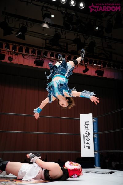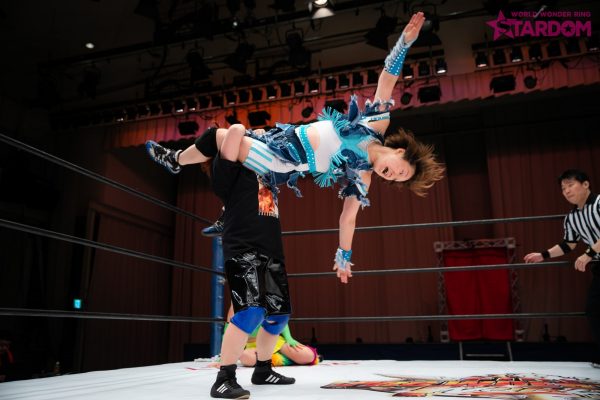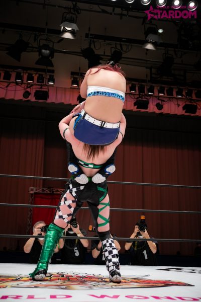 ところが、星輝が首の負傷悪化による欠場がオープニングでアナウンスされ、ナツコが第1試合の勝者と対戦することになった。バトルの勝者はスーパー・ストロング・スターダムマシン。ナツコはスーパーに呼び込まれリングイン。ナツコはいきなりマシンを場外に送り出し無人の客席に叩きつける。水を顔面に噴射すると余裕でカムバック。戻ってきたスーパーに顔面ウォッシュの洗礼を浴びせる。ナツコは串刺しラリアットからキャノンボール。フロッグスプラッシュはスーパーが返す。逆水平の応酬からナツコが連打。スーパーがカウンターで逆水平。スーパーがコーナーに上がりミサイルキック投下。ナツコが返すとスーパーはなぜか飯田橋。ナツコがラリアットから押さえ込むが2カウント。ナツコは昇天を決めると、あえて引き起こしてみせる。ナツコは抱え上げて旋回。そのまま叩きつける変型サイドバスター、摩利支天からスーパーから3カウントを奪った。