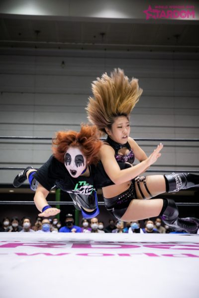 クイーンズクエストとSTARSがタッグで対戦。QQは渡辺桃&林下詩美組、STARSはスターライト・キッド&飯田沙耶で臨む。桃と詩美は元ゴッデス・オブ・スターダム王者。詩美は上谷との新コンビで空位のゴッデス王座決定戦に臨むことが決まった。まずは桃との元王者コンビで新コンビへの弾みをつけたい。対するチームの飯田はルーキー・オブ・スターダム王座決定戦で敗退も、ここ数カ月で大幅に筋力アップ。元ルーキー王者のキッドとのコンビで王座挑戦への足がかりをつかみたい。
