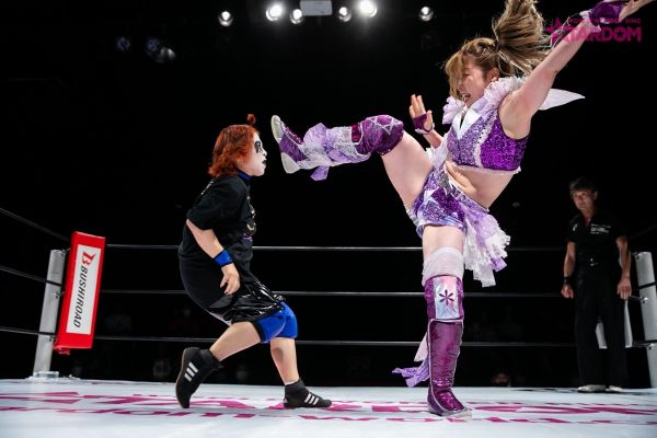 キッドが握手を求めるとひめかが歩を進めゆっくりと応じてみせる。ロックアップからひめかがロープに追い込んでクリーンにブレイクもキッドが突っかかる。キッドが振ろうとするがひめかがこらえる。ひめかはキッドの突進にショルダータックル。キッドが飛びついて丸め込むが2カウント。ひめかがキッドをキャッチしてバックブリーカーからキャメルクラッチへ。キッドがなんとかロープに逃れるがひめかはロープ越しにキャメルクラッチを決める。これを解くと背中へのストンピングを連打しコーナーに追い込み顔面を踏みつけていく。ひめかがロープに振るとキッドが「なめんじゃねえ!」とスイングDDT。キッドがコーナーに上がるとひめかがパワーボムの構え。キッドが切り返し619、その場跳びムーンサルトプレス。返したひめかにキッドはフィッシャーマンの体勢。ひめかがこらえるとキッドはコルバタ。ひめかがコーナーに振って串刺しで突進。キッドがかわすがひめかが至近距離からニー。ひめかは逆片エビ固めでキッドを捕獲。キッドがエスケープも背後からのニーを食らう。キッドが返すとひめかはアルゼンチン。キッドが切り返し串刺しで突進。ひめかが足を出すがキッドはアームホイップ。キッドがダイビングボディープレスも2カウント。キッドはフィッシャーマンで叩きつけてみせるがひめかがクリアー。キッドがダッシュするとひめかがジャンピングニー。キッドが返すが、ひめかはフィニッシュを予告しパワーボムの構え。キッドが切り返し丸め込む。ひめかが返すとカウンターのラリアット。キッドが丸め込むがひめかが返す。ひめかは至近距離からラリアット。逆エビ固めでそり上げるがキッドがロープに到達。するとひめかがアルゼンチンバックブリーカー。キッドがギブアップしひめかが3連勝となった。