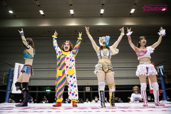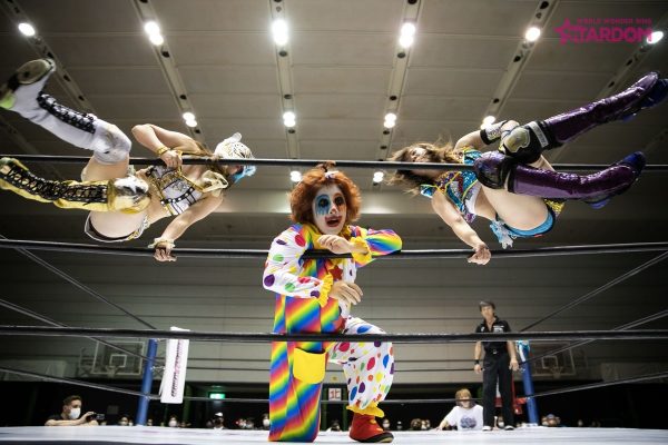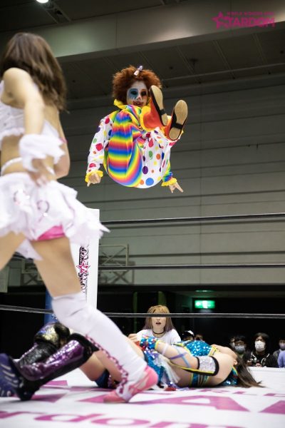 ゴキゲンです☆はピエロをモチーフとしたメイクとコスチューム。両軍握手をかわすとゴキゲンは「STARSでーす!」と喜びのアピール。先発はキッドと里歩。ハイスピードなロープワークが展開される。岩谷とゴキゲンが対峙、と思いきや、ゴキゲンがDEATH山さん。時代と変わらぬ四方へのアピール。これまでと違うのはほかの3人もいっしょにポーズを取ること。岩谷組が合体するが里歩組が切り返し翻弄する。ゴキゲンが岩谷に地獄突き連打もドロップキックをカウンターで食らう。岩谷組がゴキゲンに次々と串刺し攻撃からダブルのドロップキック。岩谷がゴキゲンにサッカーボールキック、串刺しドロップキック、ボディースラム。ゴキゲンが返すと岩谷が腕を捻りあげていく。替わったキッドがヘアーホイップの連続、ロープに固定すると背中へのドロップキック。岩谷がゴキゲンにグラウンドでフェースロック。ゴキゲンがロープに逃れると岩谷がストンピング連打。しかし顔を見ると思わず苦笑い。替わったキッドがゴキゲンにボディースラムからキャメルクラッチ。岩谷がそこへドロップキック。ゴキゲンの突進をキッドが連続でかわしていく。キッドがドロップキックもゴキゲンが地獄突きで突き倒す。里歩がクロスボディーアタック、ダブルをかいくぐりドロップキック、岩谷にコルバタ。キッドが里歩にコードブレイカー。里歩の突進を岩谷がかわしドロップキック。里歩が岩谷にダブルリスト。ゴキゲンが岩谷にセントーンもかわされる。岩谷は延髄斬りからジャーマン。キッドを呼び込みコーナーで合体、しかしカットされゴキゲンが岩谷にダイビングセントーン。返されたゴキゲンはもう一度コーナーへ。そこへキッドが雪崩式アームホイップ、岩谷がフロッグスプラッシュ。決まったと思われたがゴキゲンが返す。岩谷とキッドが619とその場飛びムーンサルトで共演。「ヨネヤマ!」と叫んだ岩谷の蹴りをゴキゲンがかわして里歩が援護、ゴキゲンが丸め込むと3カウントが入った。