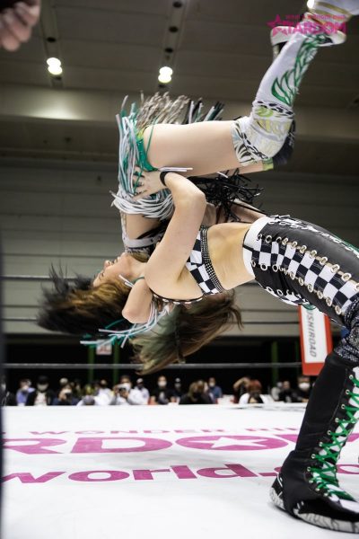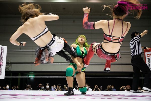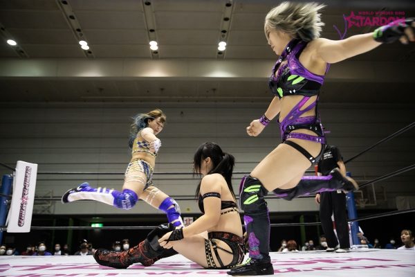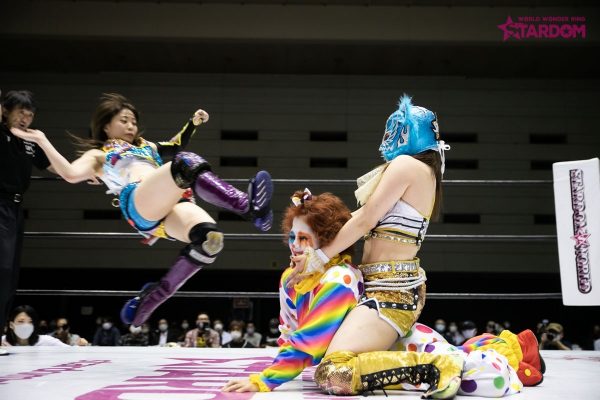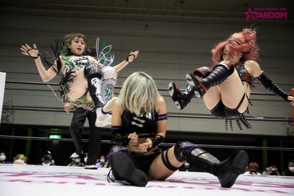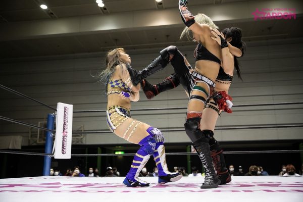 中野が握手を求めるとなつぽいは足蹴りで応じず不穏な空気に。中野となつぽいが先発で対峙するといきなりなつぽいがクロスボディー。蹴りをかわし合いなつぽいが丸め込み。すぐに中野が切り返し両者がキックで威嚇する。朱里が飯田にストンピングの連打からスリーパーで捕獲。朱里がなつぽいを呼び込みロープに振るとキックのコンビネーションからダブルでドロップキックを叩き込む。朱里は飯田にサッカーボールキックから片足でカバー。飯田が返すと朱里は自軍コーナーに叩きつける。なつぽいは飯田の顔面を踏みつけて串刺しドロップキックの連打。朱里が飯田を引き起こして胸板にミドルキック。朱里は飯田を挑発。飯田が立ち上がりながらエルボーを連打。朱里はニーで倒してストンピング連打。なつぽいが飯田にボディースラムを連発、リング下の中野に見せつけるように滞空時間を取っていく。なつぽいはストンピングから低空ドロップキックを顔面へ。つづいて朱里が顔面へのニー。なつぽいがロープに振ると飯田がかわしてドロップキック。中野がなつぽいの後頭部へニーアタック。しかし朱里が乱入しカット。中野は2人を相手にDDT。中野はなつぽいに側転ダブルニー。なつぽいが返すと中野が突進。なつぽいがネックブリーカーからキューティースペシャル。朱里が中野へミドルキック連打、串刺しニーアタック、フロントネックチャンスリードロップ、コーナーからの1399でたたみかける。中野が返すとエルボーの応酬。朱里がニー連打から狙いを済ましてのシャイニングカッター。グロッギー状態の中野を担ぎ上げるが突進をかわされ丸め込まれる。中野はバックを取りジャーマン狙い。朱里がこらえると中野はスピンキックを叩き込む。両者ダウン状態から中野がタッチ。飯田が朱里にドロップキックからバックエルボー。飯田が振って中野がトラースキック、ジャーマン。しかしなつぽいがカットに成功。中野がなつぽいを追い出すと飯田が朱里へミサイルキック。朱里が返すと飯田はノーザンライトの構え。朱里が飯田をマットに叩きつけなつぽいを抱き上げ飯田に落とす。朱里となつぽいが蹴りの挟み撃ち。朱里が飯田に山折り。しかし中野がカットする。10分経過。朱里は飯田にキックもかわされ飯田橋で押さえ込まれる。朱里が返してニーアタックからハイキック。中野のカットをなつぽいが阻止している間に朱里が飯田をピンフォールした。試合後、中野はなつぽいよりも朱里を意識し睨み合い。なつぽいが割って入ろうとするも中野の視線は朱里に向けられた。