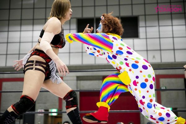 第二試合はルアカとゴキゲンです☆が組んでDDMのなつぽい&ひめかとの対戦。ゴキゲンです☆が四方にアピールしたところでなつぽいが蹴り。スピーディーな展開。ルアカが入ってくると二人でポーズ。さらにダブル攻撃を狙うがかわされなつぽいがルアカにドロップキック、ひめかがゴキゲンにショルダータックル。ひめかに代わるとボディスラム3連発。DDMが串刺し攻撃からの連携をゴキゲンに決める。ひめかの逆エビはゴキゲンが何とかエスケープ。ゴキゲンは高速のクリスチョップを決めるとルアカにチェンジ。ルアカがひめかにショルダータックルでぶつかるが倒れない。ルアカがひめかにビッグブーツ。ひめかがショルダータックルでルアカを倒すとなつぽいが低空ドロップキック。ルアカとゴキゲンが連係。ルアカのフィッシャーマンは2カウント。なつぽいのダイビングボディアタックはルアカが返す。なつぽいがバックスピンキックからのバックラッシュをルアカに決め3カウント。