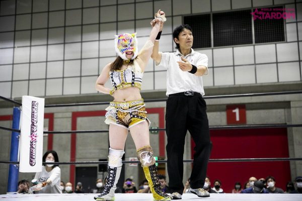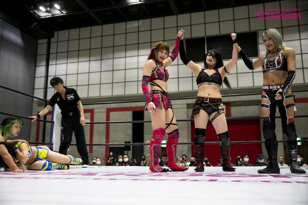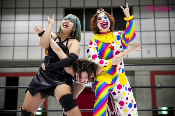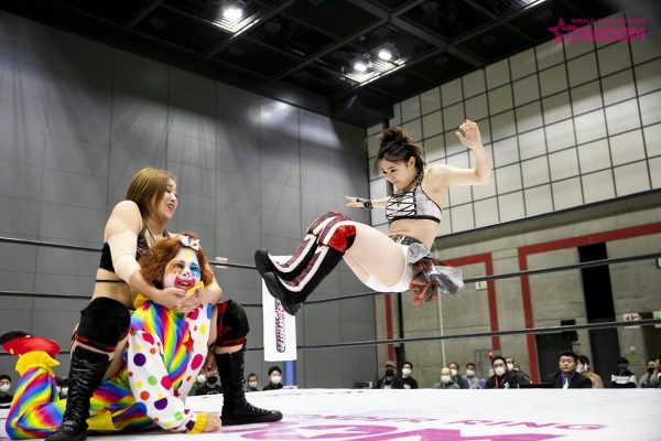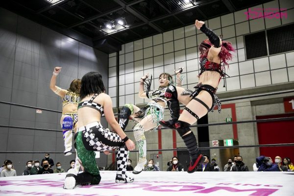 第四試合はウナギ・サヤカ&中野たむvs妃南&AZMのタッグマッチ。たむとウナギが握手を求めると妃南とAZMは受けると見せかけて先制攻撃。ウナギをロープに張り付けAZM、妃南がドロップキック。妃南がロープに走るとウナギがショルダータックル。たむとウナギが連係攻撃。たむが妃南にサッカーボールキック。ウナギに代わるとにーを叩き込む。妃南はウナギに払い腰を決めるとAZMにチェンジ。たむが入ってくるもAZMは二人に串刺しドロップキック。AZMとウナギがエルボーを打ち合う。ウナギがAZMにボディスラムからレッグドロップ。たむに代わるとローリングネックブリーカー。たむのバックドロップを切り返したAZM。たむとAZMはお互いの蹴りを読みあいかわす。たむがロープに走るがAZMのカウンターのハイキックが決まる。AZMがロープに走るとウナギが入ってきてスパインバスター。ウナギがロープに走ると妃南がドロップキック。妃南に代わるとたむにドロップキック、柔道技を連続で叩き込むも2カウント。たむが妃南にカッターからの串刺し攻撃をかわすとAZMとの連携攻撃。妃南のスリーパーがたむに決まるとウナギがカットに入る。たむが妃南にバックドロップからのフォールは2カウント。最後はたむのバックスピンキックが決まり3カウント。