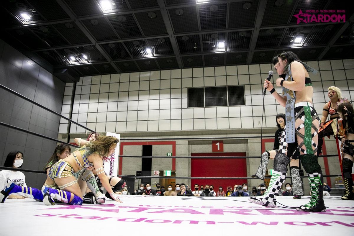 メインイベントはQQの林下詩美&渡辺桃&上谷沙弥vsビー・プレストリー&刀羅ナツコ&鹿島沙希の大江戸隊。上谷と鹿島が先発で試合スタート。鹿島がヘッドロック。上谷が低空ドロップキック。鹿島もドロップキックでやり返す。桃がビーをアームホイップ、ミドルキック。ビーが桃を場外に落とすと場外戦に。ナツコが桃を捕まえビーがPK。鹿島がロープを使って桃の足を攻める。さらにビッグブーツ。ナツコが顔面ウオッシュ、ブロックバスター。桃はナツコにミサイルキック。詩美はナツコにショルダータックル。鹿島が入ってくると大江戸隊が連係攻撃を仕掛けるが詩美が回避するとナツコと鹿島に串刺し攻撃から背中への低空ドロップキック。スリーパーでとらえるもロープエスケープ。ナツコが詩美の顔面をかきむしる。ナツコとビーのダブルのニーが詩美に決まる。ナツコのセントーンは2カウント。フロッグスプラッシュをかわした詩美は投げっぱなしジャーマン。しかしナツコもラリアット。両者チェンジ。桃とビーがエルボーを打ち合う。桃がビーに走りこんでの蹴り。さらにミドルキックを連打。ビーはロープに乗るとミサイルキック。桃がビーに蒼魔刀はビーが肩をあげる。上谷に代わるとダイビングボディアタック、ミサイルキック。ビーは高速のネックブリーカー。大江戸隊の串刺し攻撃からビーがニーを決めフォールするが桃と詩美がカット。大江戸隊が誤爆。QQのトリプルドロップキック。上谷のニールキックは2カウント。上谷にナツコがパイプ椅子攻撃からビーは串刺し攻撃ニー、クイーンズランディングとつなぎフィニッシュ。