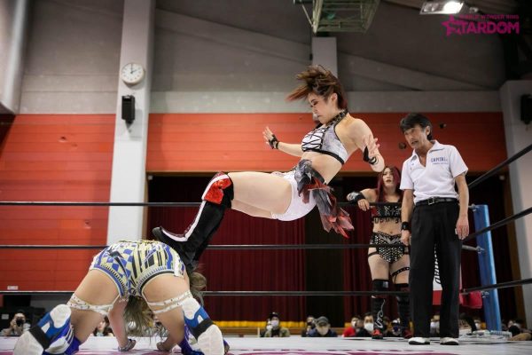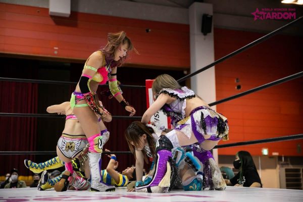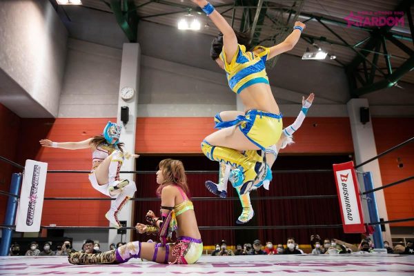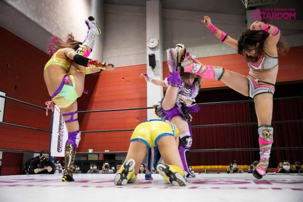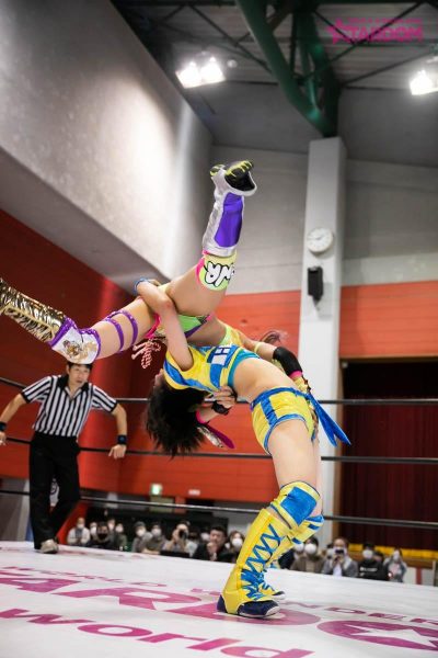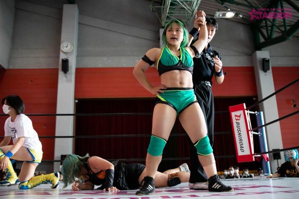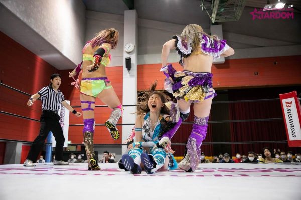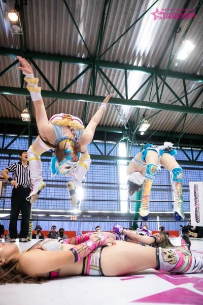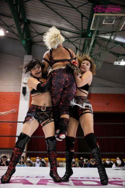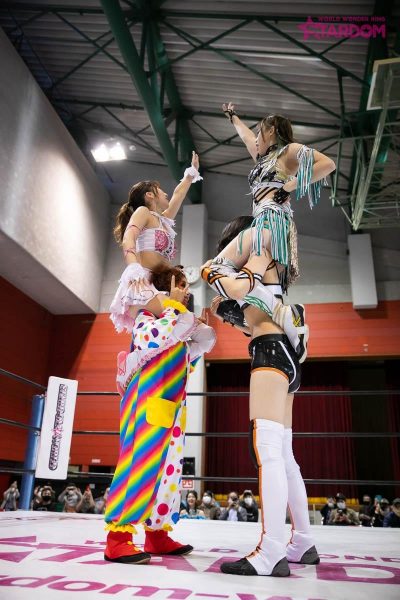 ゴキゲンがレディをコーナーに叩き付け地獄突き。里歩がレディにヘアーホイップからコーナーに追い込んで踏みつける。レディがエルボーで反撃しカウンターのビッグブーツ。上谷が里歩に串刺しニーアタックからドロップキック。里歩が返すと、上谷がミサイルキック投下。上谷はエルボーから突進。里歩がかわして619、ダイビングボディーアタック。上谷がニールキックからその場跳びムーンサルト。里歩がかわしてカバーするが2カウント。ゴキゲンが上谷に地獄突き連打。上谷が側転で翻弄しドロップキック。レディがゴキゲンにショルダータックル4連打。ゴキゲンが返すとレディがエルボーから額をつかんで打撃を許さず。レディと上谷がダブルのビッグブーツ。レディはゴキゲンを持ち上げるが形が崩れる。エルボー連打からあらためてボディースラム。ゴキゲンが返すとレディはチョークスラム。しかし里歩のカットが間に合う。レディは「もう一発!」と予告するがゴキゲンがバックを取る。里歩の地獄突きからゴキゲンが丸めこむと3カウントが入った。