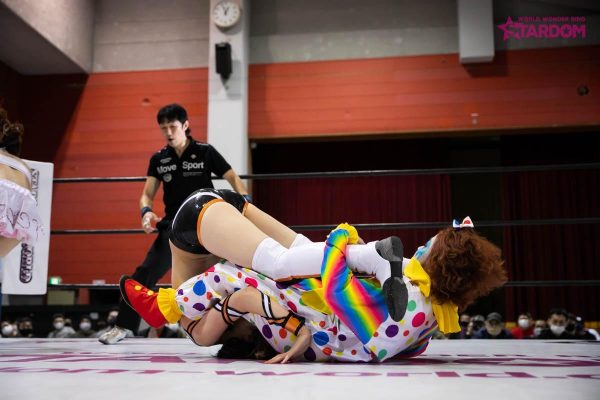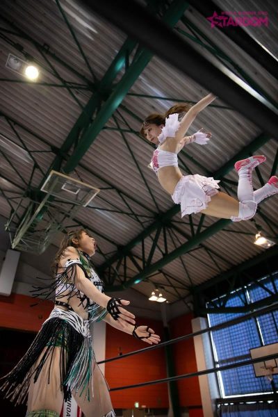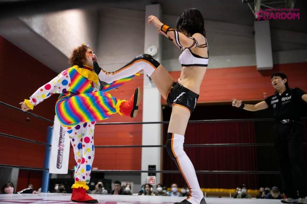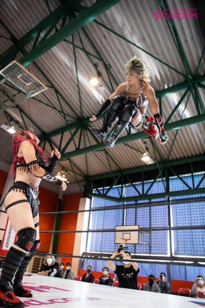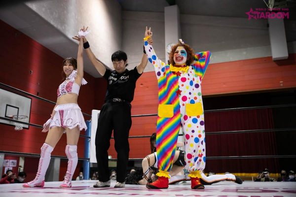 レディが里歩とゴキゲンの握手に応じる。先発をレディが買って出るとゴキゲンと対峙。ゴキゲンはいつものように四方にアピール。一通り終えるとレディとあらためて向き合う。レディが手を差し上げてゴキゲンを誘う。ゴキゲンがジャンプを繰り返すも届かず。すると里歩を肩車してリング中央へ。レディは「ダブルです!」とアピールし上谷を肩車する。両チームが向き合うと肩車を崩した里歩組が攻撃、ロープ対角線に振ると反転されるが、相手チームの同士討ちを誘って扇を作る。