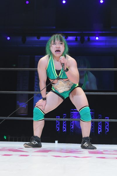 「そうですね。前チャンピオンの岩谷麻優は短期間の間に何回も防衛戦をしているので。私はそんな前チャンピオンの岩谷麻優に負けないぐらいたくさんの防衛をして、最多防衛記録を出したいので、チャンピオンとしてちんたら休んでる暇はないなと思っています。――コスチュームがチャンピオンカラーだが?