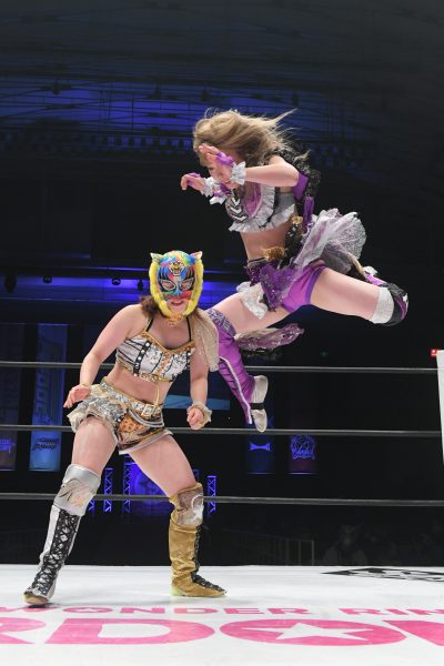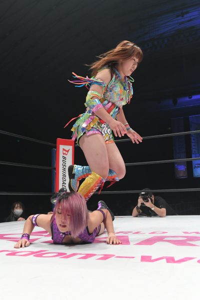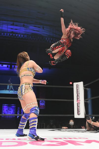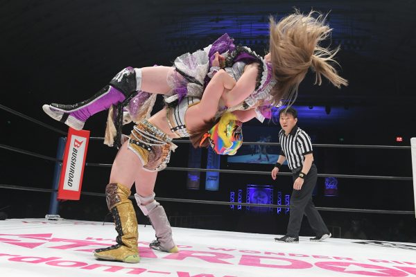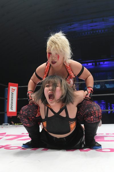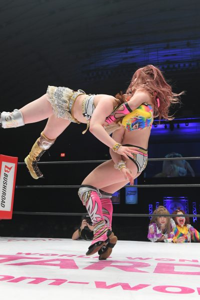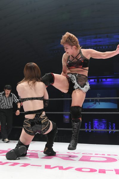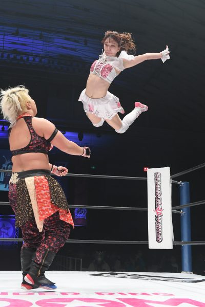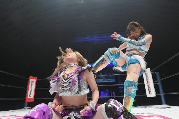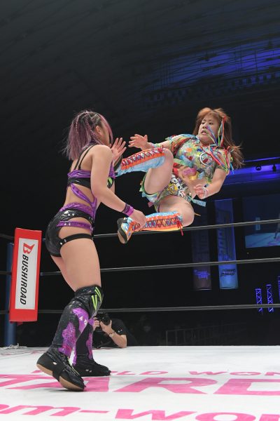 ガッチリと握手をかわしてゴング。桃が蹴りの威嚇。慎重に手四つの構えに入り、力比べ。詩美が上になると桃が腕を取って逆転。詩美が取り返すと桃も切り返してヘッドロック。詩美がグラウンドで腕を取りにいくと桃がネックロック。首の取り合いから詩美がヘッドシザーズ。桃が抜け出してブレイクする。詩美がロープに振るとかわし合いからドロップキック。詩美は桃の右脚を攻撃しエルボードロップからレッグロック。詩美は右ヒザを踏みつけニードロップ、串刺しドロップキック。桃が返すと、詩美はアキレス腱固め。桃がエスケープするが、詩美は右脚にドロップキックを放つ。桃が返すと、詩美はストンピング連打。コーナーに振られた桃がスイングDDT。桃はエプロンで場外に出た詩美にミドルキック。場外マットを外してBドライバーの構え。詩美が切り返すが桃は場外でBドライバーを決める。桃が詩美の生還を余裕で待つ。桃はリング下におり詩美を15カウントで戻すと串刺しドロップキックを4連発。桃は詩美を踏みつけて挑発。詩美が返すと、桃はキャメルクラッチへ。これを解くと喉元を踏みつける。コーナーに叩きつけると、詩美がダウン状態に。10分経過。桃がエルボーを打ち込み詩美を見下ろす。詩美がカバーを返すと、桃はエルボー連打。桃の突進に詩美がドロップキック。しかし桃は倒れずミドルキック。桃が串刺しドロップキック。詩美がかわすとショルダータックル。詩美が串刺しエルボーアタック、ドロップキック。ミサイルキック、ラリアット。フィニッシュを宣言すると一度は切り返されるも抱え上げて後方に投げつける。詩美がコーナーに上がると桃が立ち上がり雪崩式裏投げ。桃は側頭部への蹴りを見舞う。2発目を詩美がキャッチしスリーパーへ。胴締めのフロントネックロックに移行し15分経過。桃がエスケープすると、詩美がパイルドライバーの構え。切り返した桃がBドライバー。両者ダウンとなり、8カウントで立ち上がる。桃がドラゴンも、詩美がすぐに返してエルボーの応酬。桃が崩れるがカウンターでハイキック、蒼魔刀、ドラゴンスリーパー。胴締めでグラウンドに移行するが詩美がエスケープに成功。桃はコーナーに上がりダイビング蒼魔刀。詩美が返すとコーナーの桃に雪崩式コウモリ吊り落とし。20分経過。詩美がアルゼンチンからトーチャーラックボムへ。しかし桃の肩が上がる。桃は三角絞めにいくが詩美がリフトアップし叩きつける。詩美はカナディアンから高々と旋回、しかし桃が切り返してドラゴンスリーパー。桃はテキーラサンライズも詩美が返す。ピーチサンライズも詩美がクリアー。桃が詩美に打撃の連打。ダウン状態の詩美を起こしてピーチサンライズ狙い。詩美が切り返すが桃がもう一度狙う。詩美が切り返してバックドロップ。詩美がバックを取りジャーマン。もう一度決めるとさらにもう一回ジャーマン。しかしギリギリで桃が返す。詩美は桃を引き起こしカナディアンから高々と持ち上げて旋回、叩きつけてカバーすると3カウントが入り、詩美の防衛となった。