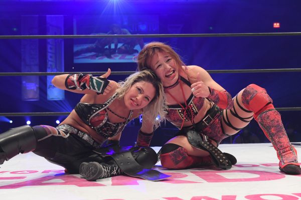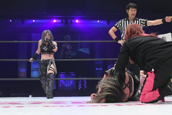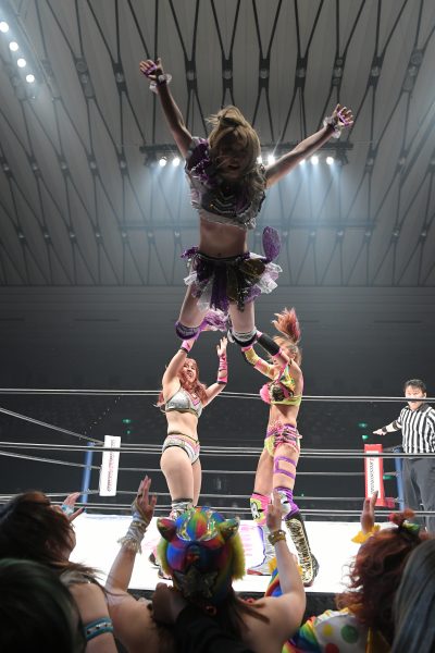 白川「アーティストのベルト、初防衛できました!なかなかつらいイリミネーションマッチでしたけど、私たちはチャンピオンとして年を越すことができます。ありがとうございます。大阪の皆さん、私たち3人ベルトを持ってまた大阪にきます。どうぞ、よろしくお願いします!」