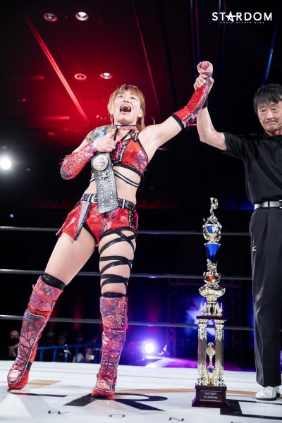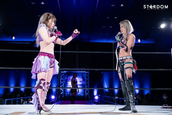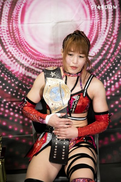 「SWAのベルトを無事防衛しました。渡辺桃、メチャメチャ強い。でも私は、まだ絶対負けるわけにはいかない。このSWAのベルトも防衛し続けて価値を上げる。そしていま林下詩美が持ってる赤いベルトも、もちろん狙っていくつもりです。いまコロナという状況で海外の選手とこのSWAのベルトを懸けての試合ができないんですけど、もちろんコロナがあけたら海外の強い選手としていって、このベルトを防衛していきたいと思ってます。それまでは絶対、それ以降も絶対防衛し続けます。そして今日、渡辺桃ちゃん試合をして、2月10日にSEAdLINNNG試合があると思うんですけど、決まってたと思うんですけど、そこのセコンドに自分はいきたいなと思ってます。やっぱりこれは、ユニットの問題ではない、スターダム全体の問題だと思ってるので自分もセコンドにいって、しっかりとスターダム側として闘っていきたいと思います」