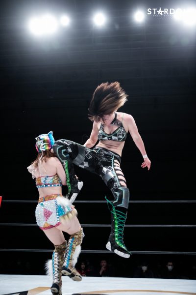 STARSナンバーツーのポジションを掴みつつあるスターライト・キッドが、元ワールド・オブ・スターダム王者のビー・プレストリーと一騎打ち。白いベルトに挑戦した経験を元ワールド王者にどうぶつけるか。プレストリーの打撃をうまくかいくぐれば、キッドにも勝機は見えてくるはず。番狂わせに期待がかかる。