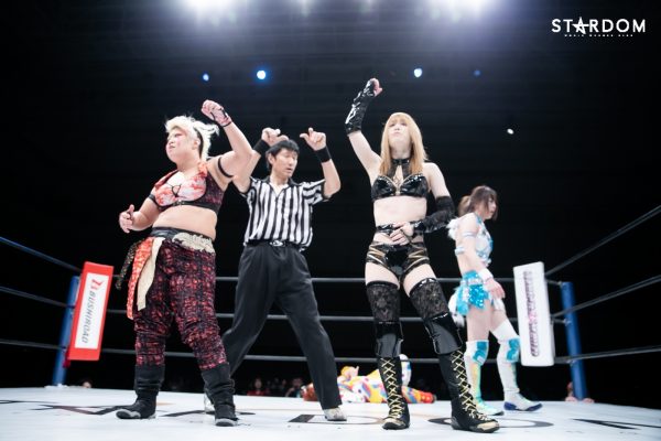 詩美と上谷の先発でゴング。同時にAZMも突進し奇襲攻撃、上谷のドロップキックからダブルのドロップキックを打ち込む。上谷がカバーするが詩美が1カウントで肩を上げる。詩美はAZMを外に出して上谷にボディースラム。上谷がすぐに返すと詩美は桃に託す。桃が上谷の顔面を自軍コーナーで踏みつける。中央に持っていくとサッカーボールキックから片ヒザでカバー。上谷が返すと、桃はエルボー連打。桃が両手を広げて挑発すると上谷が「なめんな!」と向かっていく。桃が押し倒して突進、ドロップキックを払いのける。しかしこのあと上谷がドロップキックを命中させる。AZMが桃にブレーンバスター狙い。詩美が入るとAZMが2人まとめて腕を取る。上谷が桃を蹴飛ばし詩美を指名。桃の蹴りをもう一発かわすと控えの詩美に向かっていく。桃が「こっちだろ」とミドルキック連打でダウンさせる。詩美が入ってショルダータックル連打。上谷が返すと詩美はスリーパー。上谷がエルボーも詩美がサイドバスター。上谷が返すと、詩美はアルゼンチンで担ぎ上げる。上谷が逃れると詩美がエルボー。上谷も応戦してやり返していく。エルボー合戦から詩美が強烈な一発で倒すが上谷がカウンターのドロップキック。低空でも、もう一発決める。上谷はコーナーからダイビングボディーアタック、ノーザンライト。しかし桃がカットに成功。上谷はフィニッシュを宣言してスタークラッシャーの構え。こらえられると二段蹴りを放つ。上谷が突進すると詩美がラリアット。両者タッチをかわしAZMと桃がリングイン。かわし合いから桃が串刺しドロップキック、裏投げ。AZMが返すと、桃はチキンウイングフェースロック。AZMがテキーラ狙いをかわして変型卍固め。桃がこらえてコーナーに振るとAZMがかわしてフランケン。桃が返すと、AZMはワキ固めへ。10分経過。桃がエスケープすると、AZMがダッシュ。詩美が入ってダブルで叩きつける。詩美がAZMへ串刺しエルボー、ミサイルキック。AZMが返すと、詩美はアルゼンチン狙い、AZMが丸め込みから腕をロック。詩美がエスケープすると、AZMの突進を桃がキャッチも上谷がニールキックでカットする。上谷はフランケンで詩美を場外に送り出すと、ノータッチトペコンヒーロ。AZMがフィニッシュを宣言して詩美にダイビングフットスタンプ。しかし詩美が返してみせる。AZMはミスティカ式ワキ固め。詩美が逃れるとAZMがハイキック、コーナーから雪崩式狙い。詩美が阻止してバックフリップ。桃がコーナーから蒼魔刀もかわされて誤爆、AZMが詩美に飛びついてワキ固め。詩美がエスケープすると、AZMが突進、桃がハイキック。詩美はAZMにぶっこ抜きジャーマン。しかし上谷がカットする。上谷のダッシュを詩美がラリアット、トーチャーラックボムで叩きつけると、AZMが返せず3カウントが入った。