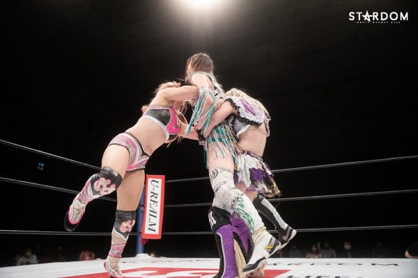 上谷が中野を指名しゴング。グラウンドの攻防でスタートし、上谷が投げを打つと中野がやり返す。中野が正面から蹴りにいくと上谷がかわしてカバーの応酬に。詩美と白川が対峙してロックアップ。白川がとらえると中野が介入してダブルの攻撃を見舞う。白川が走ると詩美がドロップキックで迎撃。上谷が入り連係攻撃のお返しを見舞っていく。詩美が白川の首を取って上谷に託す。上谷は白川にストンピングの連打。上谷は滞空時間を取ったボディースラム。白川が返すと上谷が連続で押さえ込み。しのいだ白川だが相手コーナーに連行される。替わった詩美がドロップキック。上谷がストンピング連打。白川がネックブリーカーから中野にタッチ。中野が上谷に串刺しエルボーアタックもかわされてしまう。しかし中野は2人をコーナーに追い込んで串刺しエルボーアタックを成功させる。さらにコーナーからまとめてダイビングボディーアタック、上谷には側転ダブルニードロップ。上谷がエルボーで向かっていくと中野がやり返す。エルボーの打ち合いから上谷がダウン、中野が仁王立ち。中野の突進に上谷がドロップキック。詩美がショルダータックルで中野を吹っ飛ばすと相手コーナーからミサイルキック。詩美は中野を担ぎ上げるが切返される。中野が詩美にバックドロップ。白川が詩美に串刺しエルボーアタック、サイドからのドロップキック。詩美が返すと、白川が先回りしてコルバタ式河津落とし。詩美を起こすとボディースラムの構え。詩美がこらえてアルゼンチンを狙う。白川が切り返しエルボー連打。詩美が突進をかわしてバックフリップ。白川が返すと、詩美がフェースロック。10分経過。詩美が中央に戻してスリーパー。詩美がコウモリ吊り落としを狙うが中野がカット、白川がパワースラム。白川のダッシュに詩美がカウンターのラリアット。上谷と中野がリングイン。エルボーの打ち合いから上谷が串刺しボディーアタック、ドロップキック。中野が返すと残り3分。中野が飛びついて腕を固める。しかし詩美がカットする。上谷は詩美と合体しビッグブーツ、サイドスラムの連係。上谷は中野を引き起こし、スタークラッシャー狙い。中野が切り返すがスピンキックをかわされる。中野はカウンターでスピンキックを決めるとバックを取って白川がフライングクロスチョップの連係。中野が上谷にタイガーを狙う。残り1分。中野がロープに振ると上谷がニールキック、二段蹴り。しかし白川がカットに成功。詩美がドロップキックも白川が空中胴締め落とし。残り30秒。上谷が中野にフィッシャーマン、中野が返すと上谷がスタークラッシャーの体勢。しかしここでタイムアップの引き分けとなった。