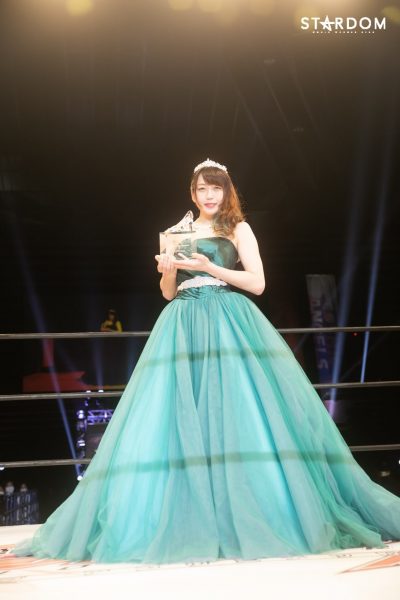「私はいままでプロレスに出会うまで、ダンスとかアイドルとかたくさんやってきてホントにつらいことばかりでなかなか努力しても報われることがなかったんですけど、はじめてこうやってプロレスラーとして、はじめてシンデレラというひとりで、たったひとりでのタイトルを手に入れることができて本当にうれしいです。私は今日で未来のスターダムからシンデレラになりました。だからこれからは、正真正銘のスターダムを目指して頑張っていきたいと思います」
