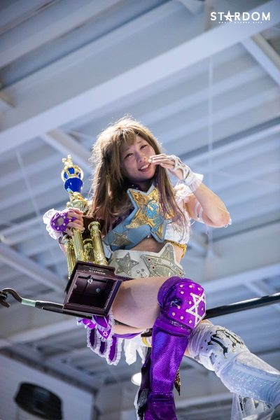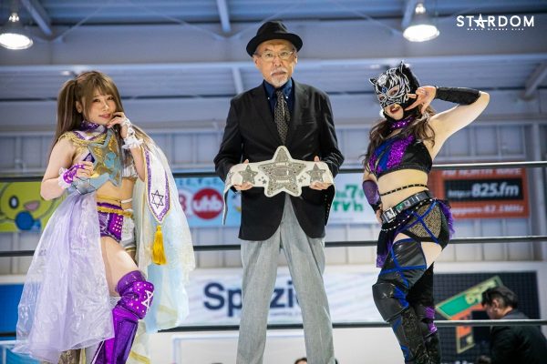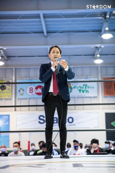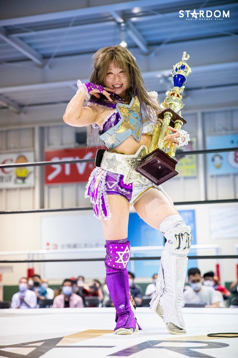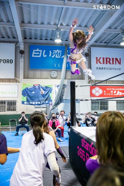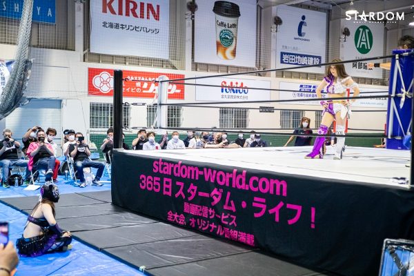 中野「宇宙のみなさん、札幌のみなさん、こんにちは! 白いベルト3度目の防衛に成功しました。来週からスターダムはシングルのリーグ戦5★STAR GPが始まってその期間中は防衛戦はできないけど、10月からたくさんたくさん防衛して、みなさんの記憶にも、スターダムの記録にも残る聖なる白いベルトの王者になっていくので、これからもスターダムを信じてついてきてください。札幌の地でこれがみなさんとできるのがとってもうれしいです。ちゃんみな、ウナギ、リングに上がって」