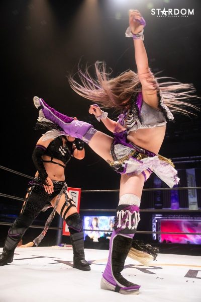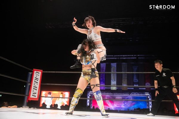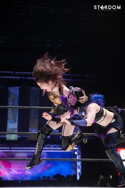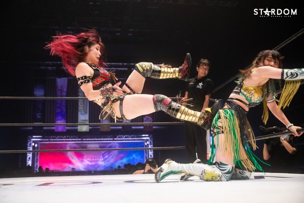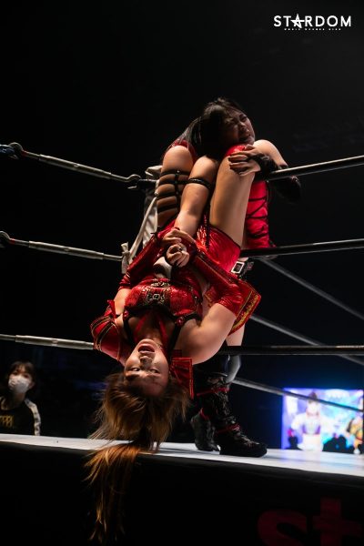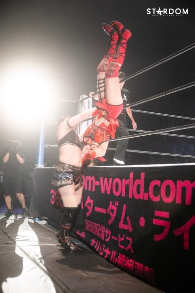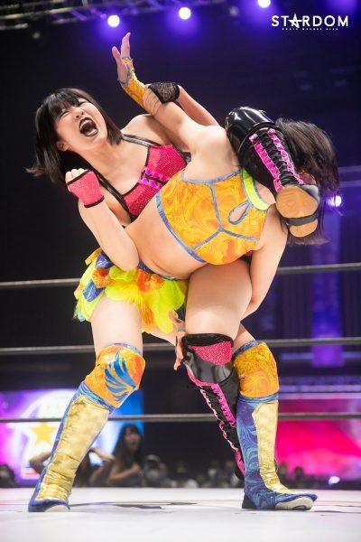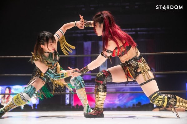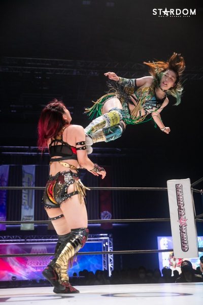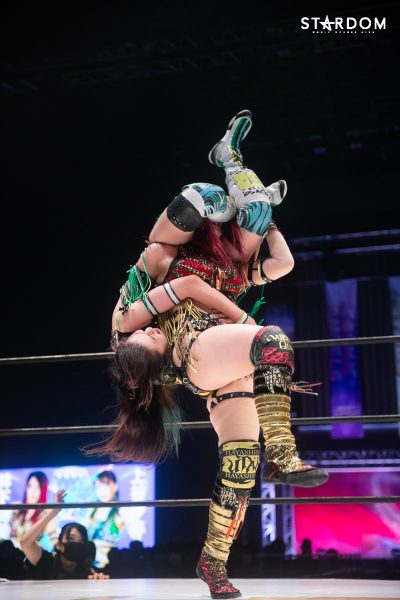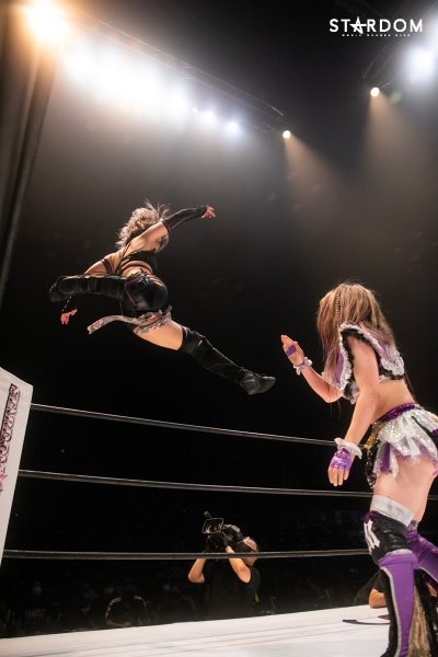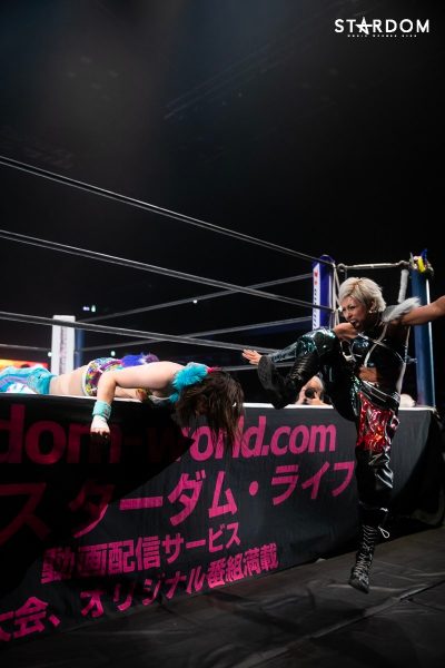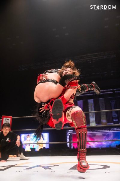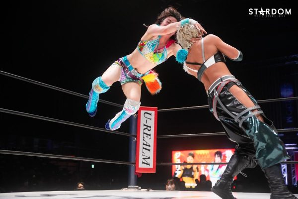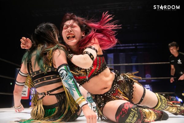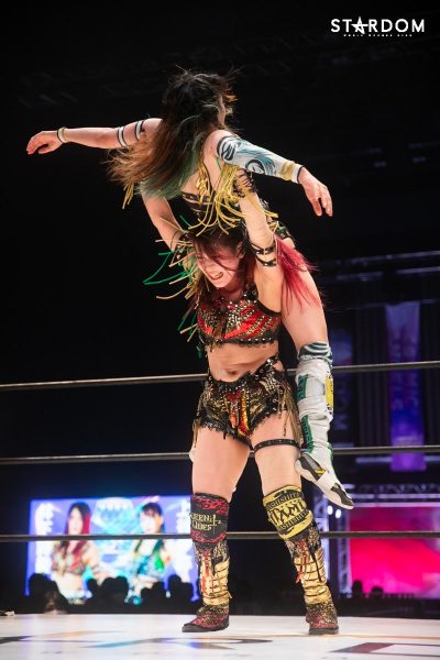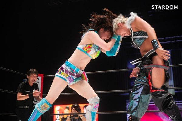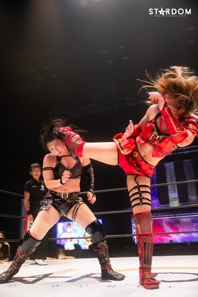 ともに前日に勝利を挙げた朱里と舞華がドンナ・デル・モンド同門対決。朱里は上谷沙弥、舞華は林下詩美と両者ともクイーンズクエストを破っての2日目となる。5★STAR GP優勝であらためて赤いベルト取りに乗り出したい朱里と、シンデレラ・トーナメント制覇をあと一歩で逃し、「スターダムの女帝」への道を再び歩み出した舞華。目標達成のために、どちらも負けたくない一戦である。