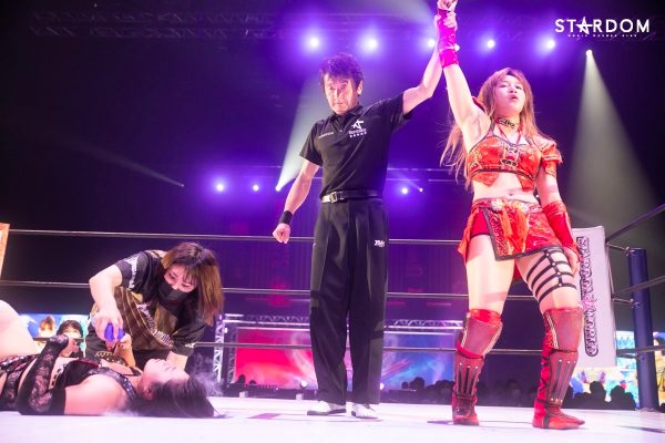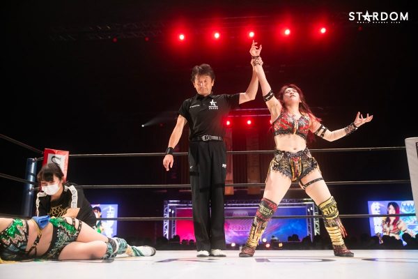 グラウンドの攻防で朱里が上になる。いったんブレイクし、舞華がグラウンドでヘッドロック。フロントネックロックに移行するが朱里が腕を取る。腕の取り合いから朱里がレッグロック。舞華がエスケープし、組み合ってスタンディングへ。首を取って押し合い舞華がロープに追い込む。朱里が押し戻していくが舞華が持ち上げて前方に投げ捨てる。朱里が蹴りを入れてコーナーに振るが舞華がかわしてみせる。朱里はコーナーに追い込んで突進もかわされる。朱里がコーナー上で待ち構え腕十字をぶら下がりで極める。舞華がリング下でラリアットも朱里がかわしてサッカーボールキック。朱里はスイングDDTも舞華がかわして持ち上げるとエプロンに叩きつける。朱里が至近距離からドロップキック。コーナーに上がると舞華も上がって雪崩式ブレーンバスター狙い。朱里が切り返してパワーボムを狙う。こらえられるが臀部へのキックで落としてみせる。舞華がカバーを返すと、朱里はスリーパーへ。朱里の突進を読んだ舞華がラリアット、しかし朱里がかわして腕固め。首を取り合っての力比べから舞華が押し込み朱里が戻していく。舞華のブレーンバスター狙いを朱里がDDTで切り返す。朱里のハイキックを舞華がブロック。朱里がコードブレイカー、延髄斬り。舞華がこらえてラリアット。両者ダウン状態から、両手を取り合って立ち上がり力比べ。この体勢でヘッドバットを10発以上打ち合う。再び両者ダウン状態。舞華が手を取って立ち上がり朱里がアームロックで飛びつく。舞華がリフトアップしブレーンバスターで投げきっていく。朱里が返すと、舞華が山茶華。朱里がミドルキック連打、舞華がショルダータックル連打、ラリアット。朱里が返すと、舞華はスリーパーに入る。朱里の脚がロープに届く。舞華が引き起こし持ち上げるが、朱里がジャーマン。舞華が高角度のバックドロップ。そして舞華が雪崩式ブレーンバスターを決めると15分経過。朱里が返すと、舞華は炎華落とし。しかし、朱里の肩が上がる。もう一発狙うが朱里が丸め込みからニーアタック。舞華がラリアットも朱里がクリアー。舞華の突進に朱里がハイキック。舞華が返すと、朱里は顔面を蹴り上げる。流炎で叩きつけると3カウント。朱里が開幕2連勝となった。