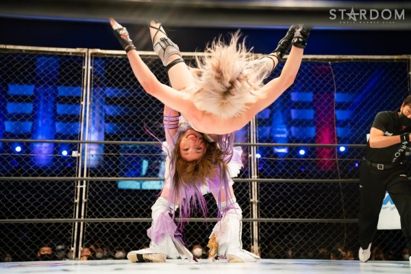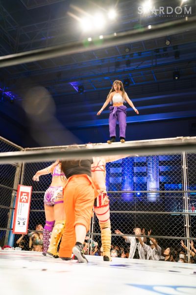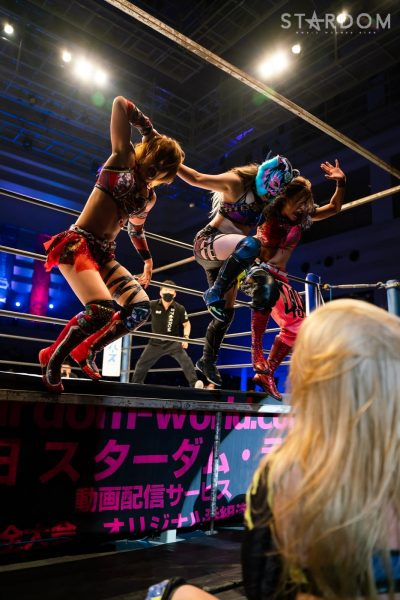 STARSの岩谷麻優&葉月&コグマ組とクイーンズクエストの林下詩美&上谷沙弥&AZM組がケージを使っての6人タッグマッチで激突。前回の名古屋大会でAZMのハイスピード王座に挑んだコグマは、敗れたものの次なる闘いを示唆。それがケージマッチだったということになるのだろう。コグマは金網から飛ぶことを前提にAZMに提案。そこからユニット対決の様相を呈し、このカードが決定した。まったく新しいタイプのケージマッチの行方やいかに?