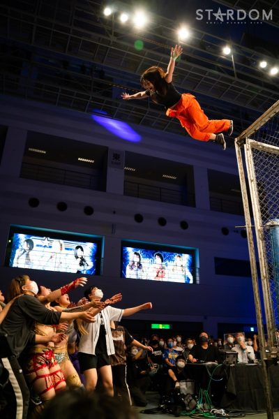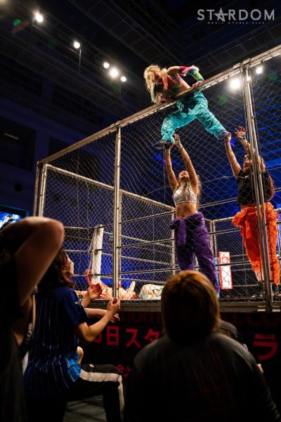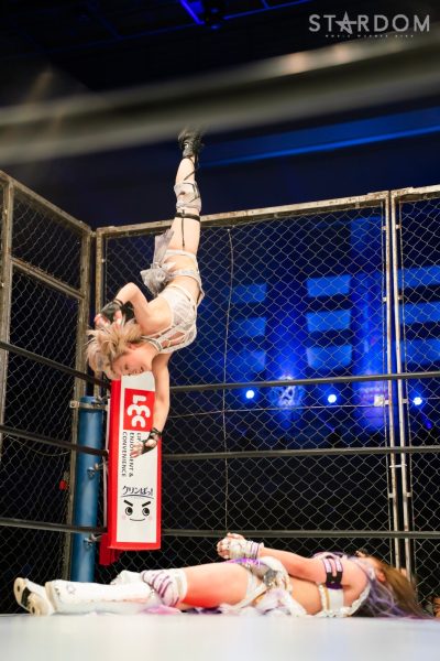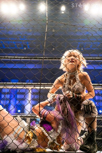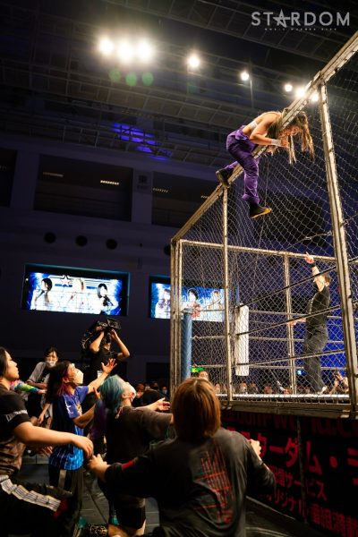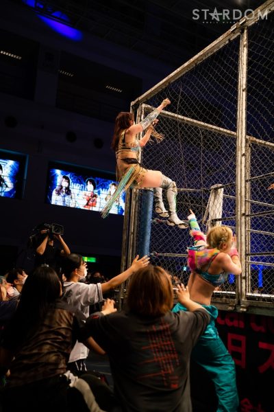 試合は3カウントフォール+エスケープルール。ピンフォールを奪った選手が金網から完全に出た時点で決着となる。セコンドがドアを閉め施錠。ゴングが打ち鳴らされるが両者ともコーナーから動かない。ゆっくりと歩を進め睨み合い。中野が髪をつかみ金網に投げつけエプロン際でもつれ合うと、中野がマウントを取りパンチの連打から顔面を金網に叩きつけていく。顔面をこすりつけるとさらに顔面を金網に叩きつける。リング中央でパンチを見舞いマウントパンチも連打。レフェリーが止めに入り「拳はダメだ」と注意する。中野はもう一度なつぽいを金網に叩きつけて踏みつける。コーナーに叩きつけるとドラゴンスリーパーで宙づりに。すぐになつぽいが逃れてコーナー上の中野にドロップキック。中野は金網に激突。なつぽいが低空ドロップキックの連打、中野の頭部が金網に激突する。5分経過。なつぽいが中野の顔面を金網に叩きつける。さらにお返しとばかりに金網にこすりつけ、ニーを突き立てる。なつぽいが別方向に中野を投げ飛ばし金網を上ってフットスタンプ。なつぽいが髪をつかんで金網に押し付けると張り手。中野が張り返すと、なつぽいももう一発。バックを取ると中野が切り返しバックの取り合い。なつぽいがバックキックから突進。中野がキャッチするがなつぽいが背後から飛び乗り丸め込む。3カウントが入るとなつぽいが金網を上る。慌てて中野が足をつかんで阻止。ロープ上でエルボーの応酬。中野はロープ上で金網に向けてバックドロップ。中野がニーアタック、丸め込みの応酬から中野が3カウントをゲット。10分経過、中野が金網を上るとなつぽいも上がる。なつぽいの蹴りをかわしてカカト落とし、なつぽいが転落。しかし、なつぽいが追いかけ雪崩式ポイ捨てジャーマン。両者ダウン状態。なつぽいが立ち上がりかけるがダウン。なつぽいが立ち上がり中野を寝かせフェアリアルギフト投下。中野が返すと、なつぽいはフェアリーストレインを狙いバックを取る。中野がロープに逃れるがなつぽいがトラースキック。なつぽいがバックを取ると中野が切り返してタイガースープレックス。しかしホールドできずに両者ダウン状態。なつぽいがバックを取るが中野がスピンキック、かわしたなつぽいがタイガーも2カウント。もう一度バックを取りクロスアーム式ジャーマン。3カウントをなつぽいがゲット。なつぽいは這いつくばってロープへ向かい、金網を上がり始める。15分経過。金網を上がると中野が足を引く。中野も上がり2人ともてっぺんに。最上段でエルボーを打ち合い、張り手も打ち合う。中野が内部に落下、なつぽいも落ちる。エプロン際で2人がダウン状態。髪をつかみ合いヒザを着いた状態で、金網に顔面をぶつけ合う。中野がトラースキック、なつぽいもトラースキック。両者リング内に入り、なつぽいがクロスアームでバックを取る、中野が切り返しカウンターのスピンキック。なつぽいがポイ捨てジャーマン。20分経過。中野がタイガーも2カウントどまり。中野がスピンキックもなつぽいが立ち上がると頭部へのキック。中野がバイオレットシューティングもなつぽいが返す。中野がトワイライトドリームで3カウントをゲットするが立ち上がれず。中野がなんとか立ち上がり、金網には上がらずなつぽいを見下ろす。なつぽいが立ち上がるのを待つように見下ろす。這いつくばるなつぽいの髪をつかみ張り手。ためにためてのVSDで3カウントを奪い、這いつくばりながら金網へ。なつぽいもはいつくばって中野を追いかける。中野はスリーパーで宙づりに。もういい、もういいよとレフェリーが声をかける。中野が外してなつぽいが落下。中野は金網からエスケープ。両足が場外に出てゴング、25分5秒。中野がカギを開けてリングへ戻るとなつぽいに駆け寄る。中野の勝利が宣告されると中野がマイク。