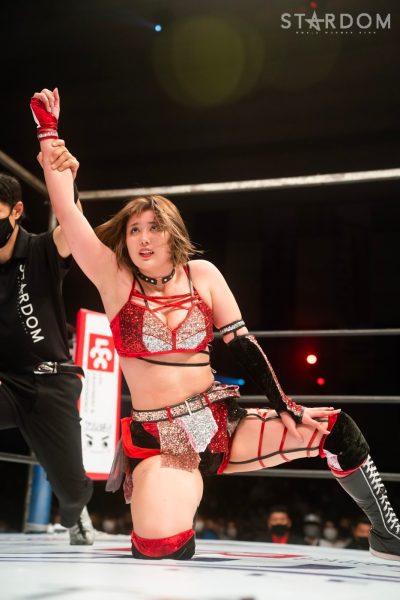 キッド「2連発! 沙希を信じて託した意味も込めて。私は厄介なジュリアと朱里を道連れにしてやったよ。自分も頭フラフラしててよくわかんないけど、史上初の3WAY、歴史的な瞬間に自分たちが立ち会えてよかったと思うし、V1したということで、今日はDDMとゴッズアイ、残りのスターダムのユニットも潰したいし、ウチらは生え抜きですからね。生え抜き同士の史上初、アーティストとかもやりたいなーなんて私は思ってるんだけど」