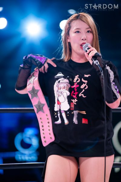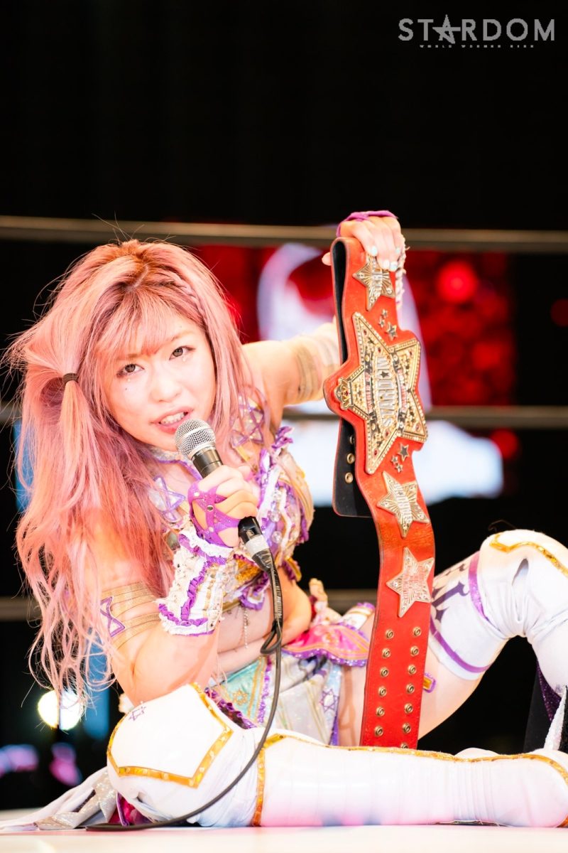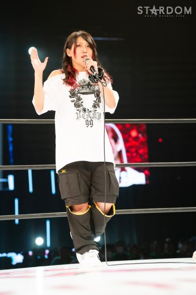 中野「あいつ誰?わけわかめですけど!この赤いベルトに挑戦するって言ってました?でかい!今年は壮絶な夏になるぞー!必ずこの赤いベルトも5★STAR GPも中野たむが制して正真正銘のナンバーワンに輝きます。みなさんこのスターダムのリングで繰り広げられる壮絶なみんなの生きざまを最後まで見届けて下さい。そして上谷、またやるんでしょ?待ってるからな!」