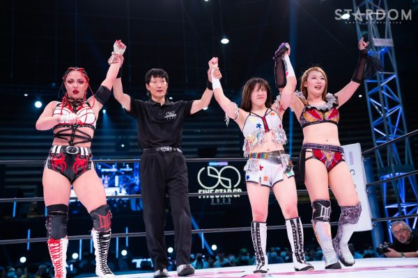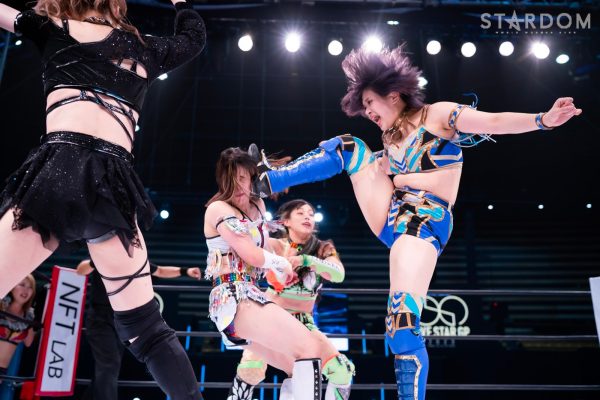 次の入場チームは、テクラ、桜井のドンナ・デル・モンドに星来芽依が加わる。ゴングが鳴る前に星来たちが奇襲を仕掛け、三人がSTARSのメンバーそれぞれをロープに振り、STARSの同時ドロップキックを避けて逆に桜井組がドロップキックをSTARSに叩き込む。そのまま三人並んでSTARSにサブミッションを決める。テクラが飯田に鎌固めをかけ、いったんブレイク。テクラがブーツで飯田に追撃。飯田は反撃のチョップを叩き込むが、テクラがエルボーで返しトラースキックで沈めたのちにドロップキックを入れ、桜井がコーナートップからミサイルキック。続けざまに桜井と星来が飯田をコーナーに振るが飯田はチョップとショルダータックルで畳みかけ、形勢は逆転。飯田からタッチを受けた向後は桜井にドロップキックを入れるも、619は回避される。コーナートップからテクラがダイビングボディアタック、桜井がダイビングエルボーを決める。コグマが桜井にフェイスクラッシャーをした流れで向後の619が今度は成功。三人での合体のフェイスクラッシャーが決まりSTARS優勢の流れになるも、桜井が向後のスワンダイブをかわしてマイ・パン・ロールを仕掛けてそのまま3カウント。
