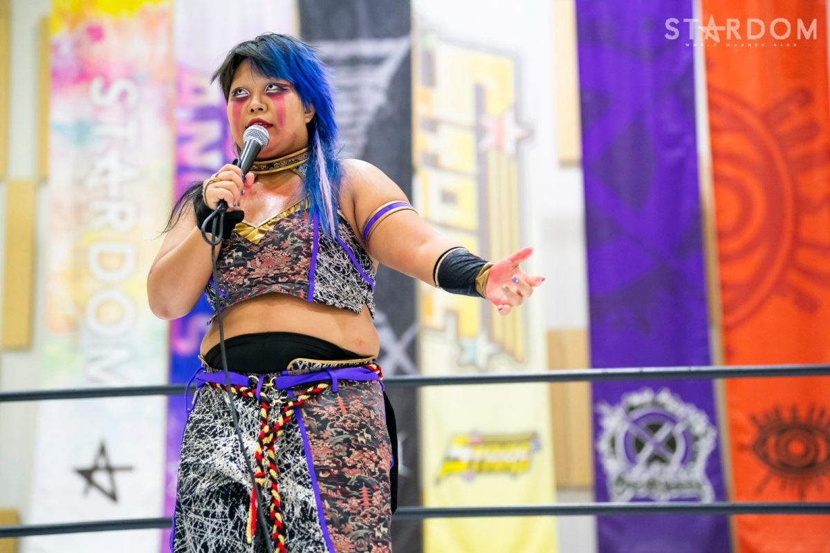 ナツコ「個人的なことを言ってしまえば、私は今日でちょうど(5★STAR GP)折り返し地点なんだよ。鈴季すず、それから一本取られたキッド、でも、でも、私は今日、オマエ岩谷麻優と、最強とも言われている朱里に勝っちゃったもんねえ。強い、私、強い。でもね、来週は愛知(名古屋)、中野たむ、それから次の日(敦賀)はなつぽい、正直、私が首を狙ってるのは岩谷でも朱里でもな、中野たむやなつぽいだと思ってるから。おい、愛知見に来ようと思ってるヤツどれだけいる? いねえのか、静岡(沼津)! まあ、来週も私がこうやってマイクで締めるから、オマエら楽しみにしといて。それじゃあ、震えて眠れ」