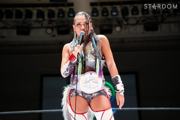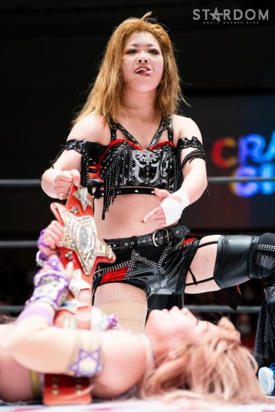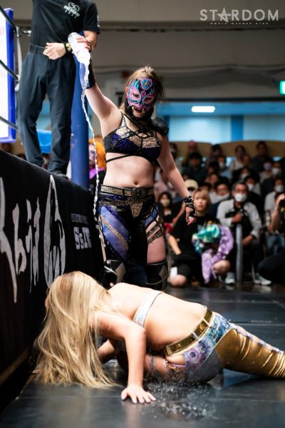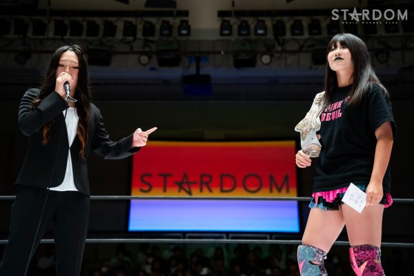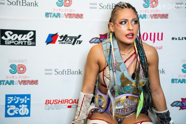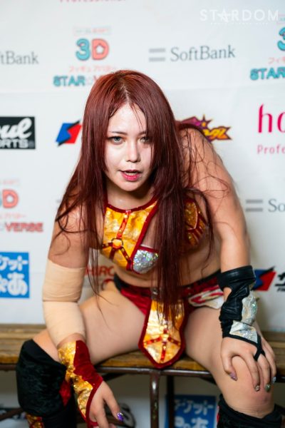 「なんだあの丸め込み。めっちゃ悔しい。悔しいけど、今日のところは1本取られました。自分はこれで3敗か。いや、今日、安納サオリとシングルで初対決、初遭遇だったんですけど、安納サオリ、めちゃめちゃ面白い選手ですね。きょうキレイに1本取られたんですけど、安納サオリはあのクールな感じに隠して、まだまだいろんな感情を持ってるような。いろんな安納サオリがいるような気が、自分の中で今日闘ってみて思ったので。このベルト、そういう感情が出てくるベルトじゃないんですかね。自分はぜひ、アナタとやりたいです。まあ、考えておいてください。今日で3敗目。3敗ってまだチャンスありますか? …ギリギリあるみたいなので、自分はリアルシンデレラです。この状況には負けません。絶対に絶対に絶対に絶対に魂こめて春・夏制覇みなさんにお見せします」