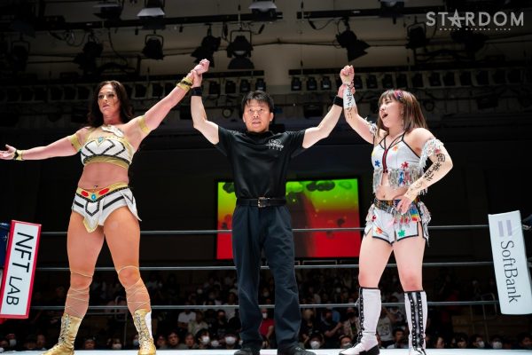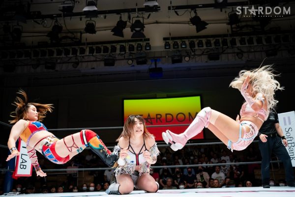 マライアが月山を肩車して入場。するとリング上でもメーガンが星来を肩車して対抗。マライアが「メガサス!」と叫んでメーガンを指名。星来が割って入り先発を志願する。試合は星来がドロップキックで先制もマライアがかわす。星来もマライアのビッグブーツをかわしてみせる。かわし合いから星来が丸め込み。マライアも返して丸め込む。マヒストラルに行くが星来が反転して丸め込みの応酬。お互いにタイムをかけ握手、マライアが引っ張り旋回式バックブリーカー。月山が入りマライアとドロップキックで挟み撃ち。月山は星来にヒップアタック連打。星来がヘアーホイップでコーナーに追い込み、メーガンに託す。メーガンは月山を別のコーナーに追い込みブレーンバスター式ボディースラム。片足でカバーするが月山が返す。星来が月山にブレーンバスター。星来の突進に月山がクロスボディー。マライアが星来にスリングブレイド、逆水平連打、コーナーに乗せるとダブルチョップを叩き込み雪崩式フランケン、ミサイルキック。星来が返すと、マライアの突進にドロップキック。星来の突進を月山が妨害しDDT、マライアがバックドロップ。しかしメーガンがカットし投げっぱなしジャーマン。月山にラリアット、星来を自軍コーナーに引っ張り強引にタッチする。メーガンはマライアに串刺しラリアット。マライアが人工衛星ヘッドシザーズ、エプロンでニー。月山がエルボー連打でコーナーに追い込む。メーガンが月山を担ぐとマライアのボディーアタックをキャッチして2人まとめてバックフリップ。月山が返すと、メーガンにエルボー連打。メーガンが一発で倒し、ブレーンバスターの構え。月山が切り返すがメーガンがマットに叩きつける。月山の突進を止めてメーガンがネックハンギングボム。星来がマライアにドロップキック。メーガンが星来を担いで場外のマライアに投げ捨てると月山にF5。3カウントが入りマライアが月山をフォールした。