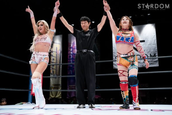マライアとキッドが先発。バックの取り合いからキッドが足を踏んで腕を取る。腕の取り合いからマライアがグラウンドに叩きつけると月山とドロップキックの挟み撃ち。月山はキッドにヒップアタック連打。月山が走るとリング下から琉悪夏が足を引き妨害。大江戸隊が月山をダブルで攻撃。正式にタッチをかわし琉悪夏がリングイン。カバーを返した月山に琉悪夏がショルダータックルを連打する。キッドは月山をロープにかけて蹴り上げる。月山がエルボー連打、キッドがやり返し琉悪夏を呼び込む。しかし月山がフェイントをかけて後方からまとめてドロップキック。大江戸隊は月山をタッチさせず、ロープに固定して攻撃。琉悪夏が月山にストンピング連打、マライアが突進を妨害し月山がドロップキック。マライアが入り琉悪夏にドロップキック、逆水平連打、ダブルチョップ。琉悪夏が介入するがマライアはまとめてミサイルキックで吹っ飛ばす。琉悪夏がカウンターのクロスボディーからフェースロック、クロスボディーアタック。大江戸隊がマライアに串刺し攻撃、キッドがダイビングボディーアタック、琉悪夏がセントーン、フィッシャーマンバスター。しかし月山がカットする。琉悪夏はフィニッシュを予告してコーナーに上がる。月山がカットするとマライアが雪崩式フランケン。琉悪夏がエルボー連打、マライアが先を読んでスリングブレイド。月山がフェースクラッシャーで援護しマライアがドロップキックもキッドのカットが間に合う。クラブビーナスの蹴りを琉悪夏がかわしマライアにショルダータックル。マライアがカウンターでビッグブーツ、ラリアットをかわしワンス・アポン・ア・タイムで丸め込むと3カウントが入った。