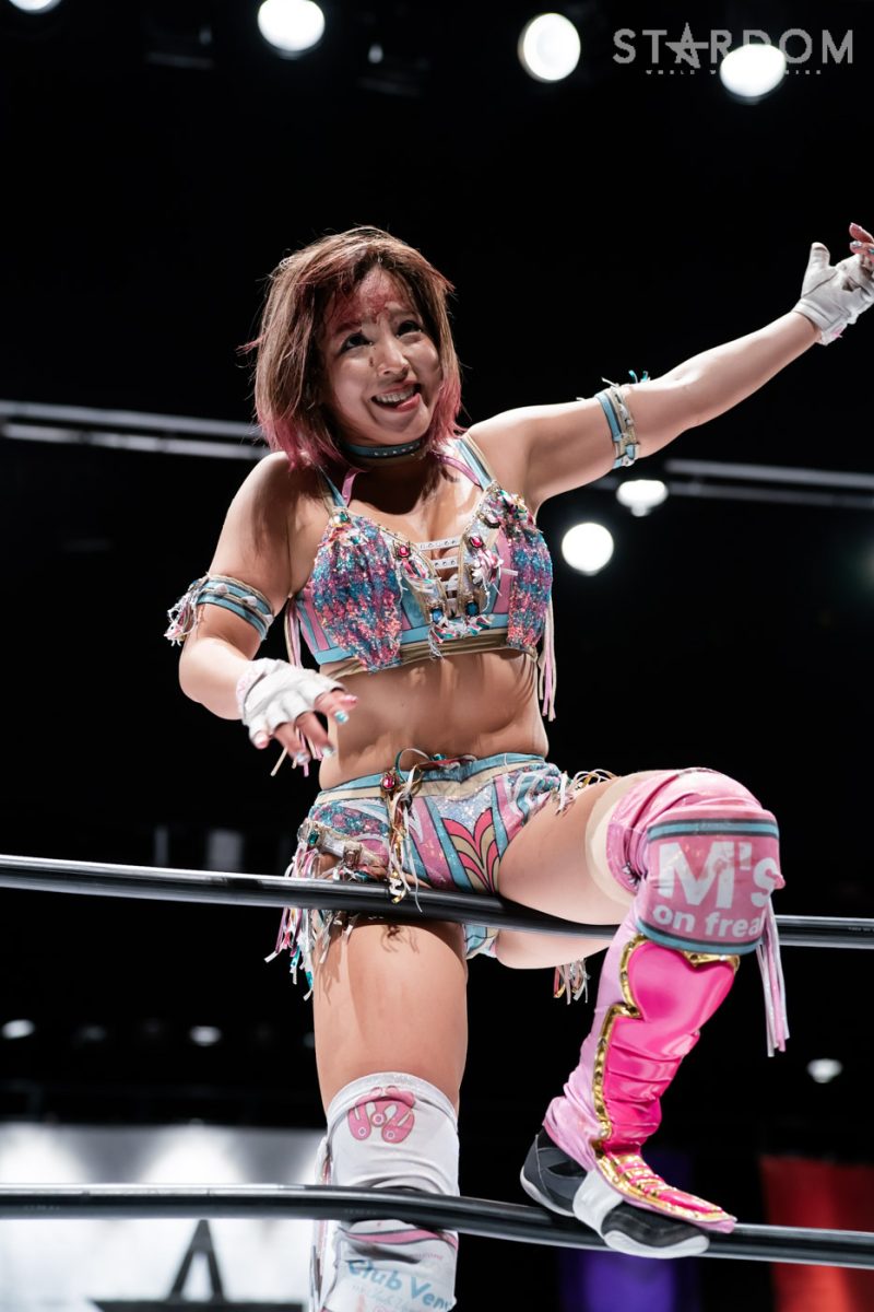 「山口のみなさん、こんばんはー!! スターダムのアイコン白川未奈です! ブーイングしてもいいんですけど。白いベルトなくなったけど、そこでプロレス人生終わりじゃない。ゴッデスなくなったけど終わりじゃない。絶対になにがあっても潰れないし、耐え忍んで必ずてっぺんいきます。渡辺桃は私の最初のシングルしたとき、もう5回目なの今日で、シングルしたときホントにこの人、白い防衛戦の記録保持者で、マジでカッコいいなと思ってた。去年その桃に勝ったとき会場が大爆発した。でも今日は勝って当たり前の自分にしたかった。そう思って一年やってきました。ちゃんみなは、折れない、くじけない、滑らない? いくらボコボコになってもてっぺんいくぞ! 舞華、サオリにも勝つ!」