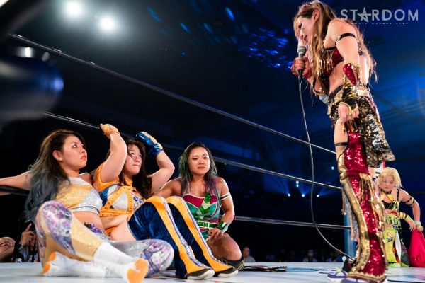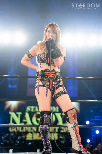 KAIRI「コグマ、コグマ! 顔上げて! 前を見て! 週プロのインタビューで、欲がないって言ってたよね。ウソじゃん。その涙が本当のコグマの本当の気持ちなんでしょ。アンタ、メチャクチャ強いじゃんかよ。葉月も、飯田君も、強いよ。なにがって、ここ(ハート)が強いじゃんか、3人とも。過去の自分に負けるな! 空気なんて読むな! いけよ! 絶対できるから。私は、3人の成功を絶対にあきらめないから。見てるからね。麻優さん。奈七永さん。こんなに強くてかわいいくて、強くて、かわいくて、かわいくて、たまにかわいいミスもするけど、やるときゃやる2人、今日、カッコいい2人と組めて本当にうれしいです。一年半という長くはない期間でしたが、スターダムの発展に貢献できたかは正直わかんないけど、でも私自身、ホントにホントに生まれ変わるくらい、たくさんの選手からたくさんのことを得て、3人からもたくさんのこと学ばせてもらった。リングは必ずつながってるから、また必ず全員強くなって会いましょう。今日は、去年欠場してしまった名古屋でこうして最後の試合を迎えることができて、本当に幸せです。人類みなきょうだい、これからも、私たちは家族ですよ、家族。これからも家族として、友だちとして、プロレス好きの仲間として、仲良くしてください。ありがとうございました」