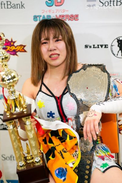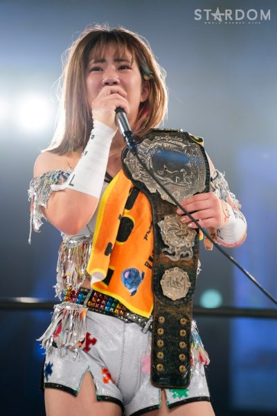 「やっと、3年前に初めて挑戦してからやっと、3年間思い続けたベルトを取ることができました。本当にプロレスが大好きです…。プロレス界に戻ってきてよかったです。ずっと戻ってきたいと思ってたぶん、ちゃんと戻ってこれたんだから、このベルトで、自分が新しいハイスピード界、変えてみせます。歴史を変えてみせます。ありがとうございました」
