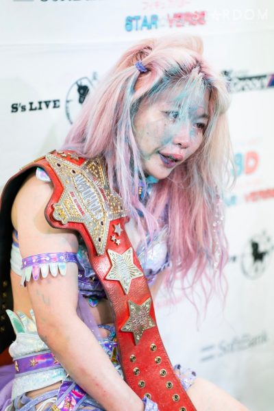 たむ「ワールド・オブ・スターダム、3回目の防衛に成功しました! ありがとうございます。ブルーベリープリンにされた。ナツコ、入場してナツコ一人でいてくれて、うれしかった。ありがとう。あんたは私の初めてのライバルだし、一生のライバルでもある。自覚持てよ。ナツコはさ、たむが運よく赤いベルトのチャンピオンになれたから、そういうキレイごとが言えるって言ったじゃん。そうかもしれないと思う。たむも運がよかったし、本当に本当に恵まれたと思う。たむもそう思ってた。頑張れば報われるって本当に限られた人だけの、成功したから言える言葉だと思ってたけど、そういう世界がイヤでたむは頑張れば頑張っただけ報われる世界であるってことを証明したくてここまでやってきた。そうして赤いベルトを巻いたんだよ。自分だけの力じゃないとは思ってるよ。だから、これからもこの最高峰の赤いベルトのチャンピオンとして頑張った、努力してる人が損をする世界じゃないってことを証明していきたいと思ってます。記憶にも、記録にも残る赤のチャンピオンになる。次の挑戦者、鈴季すず。そっちからきてくれて大歓迎。たむの本当にこの世で一番大嫌いなヤツに本当にそっくり。一番顔を見ていて腹が立つ。ブスとかひどい顔だとか、そういう野蛮な口が叩けないようにしっかり教育してあげますよ。これからもたむを信じてください。ありがとうございました」