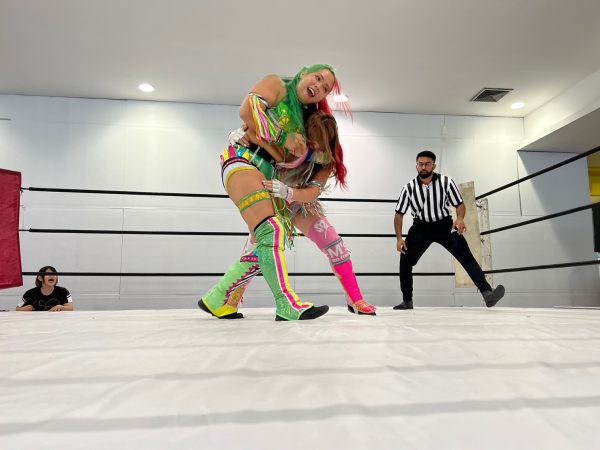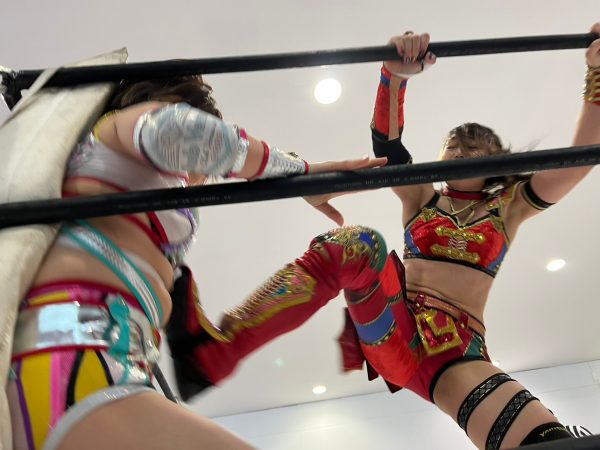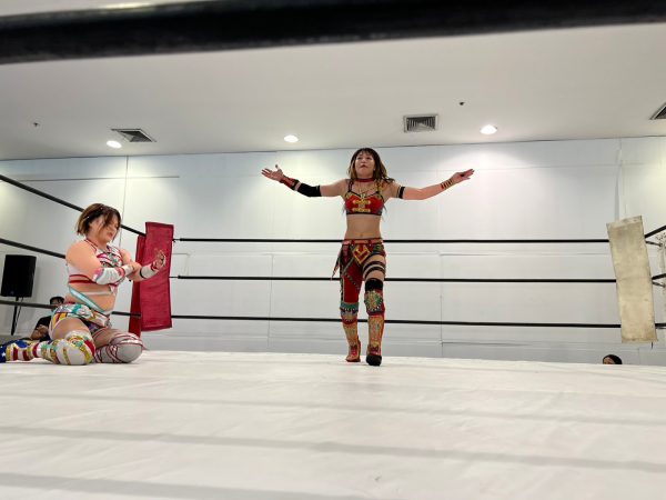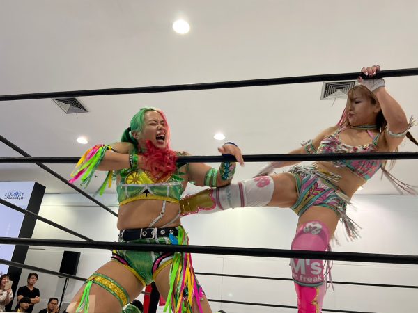 大会開始のゴングが鳴らされると大歓声につつまれた。第一試合はトーナメント1回戦で朱里(God’s Eye)vs 月山和香(Club Venus)。月山が握手を求めると朱里もガッチリ握り返し試合がスタート。月山がいきなりドロップキックからエルボー連打。朱里がロープに振ると月山のドロップキックをかわしストンピングからサッカーボールキック。朱里が串刺しニーから3連続フォールも月山が肩を上げると朱里は腕十字を決めるが何とかロープエスケープ。月山がエルボーを放つが朱里は受けて立つとミドルキック1発で倒す。月山はドロップキックからヒップアタックからヒップバット。月山のボディスラムを耐えた朱里が反対に叩きつける。朱里が腕十字から腕固めに移行するが月山の足がロープに届く。朱里がロープに走るも月山がパロスペシャルで締め上げロープに近くなると離しドロップキック、ボディスラム、極楽ドンからのフォールも2カウント。月山がフィニッシュを宣言しスープレックスを狙うが朱里がボディへニー連発からフロントネックチャンスリー、サッカーボールキックからカバーするが月山が返す。ならばと朱里は流炎を狙うが月山は切り返し丸め込みの連続も決まらない。朱里がカウンターで叩きつけるが月山がキックアウト。朱里が腕十字から腕固め、グラウンド式朱雀で締め上げると月山がギブアップし朱里の勝利となり翌日の決勝戦に進出。