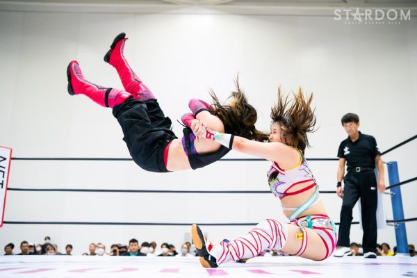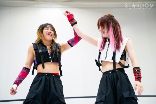 ゴッズアイの朱里&鹿島沙希組とクラブビーナスの白川未奈&月山和香組がゴッデス・オブ・スターダムタッグリーグ公式戦。ここまで朱里&鹿島組は1勝1敗で、白川&月山組は1勝。ともにまずまずのスタートを見せたと言えるが、この試合で2点を獲得した方が優位にリーグ戦を進めることができるだろう。翌日の立川では朱里&鹿島組が世羅りさ&柊くるみ組のプロミネンスと公式戦、そして白川&月山組が“極悪同盟”ダンプ松本&ZAP組をスターダムに迎え撃つ。その前に、白星を挙げるのはどちらのチームか?