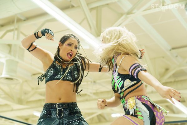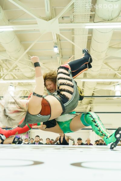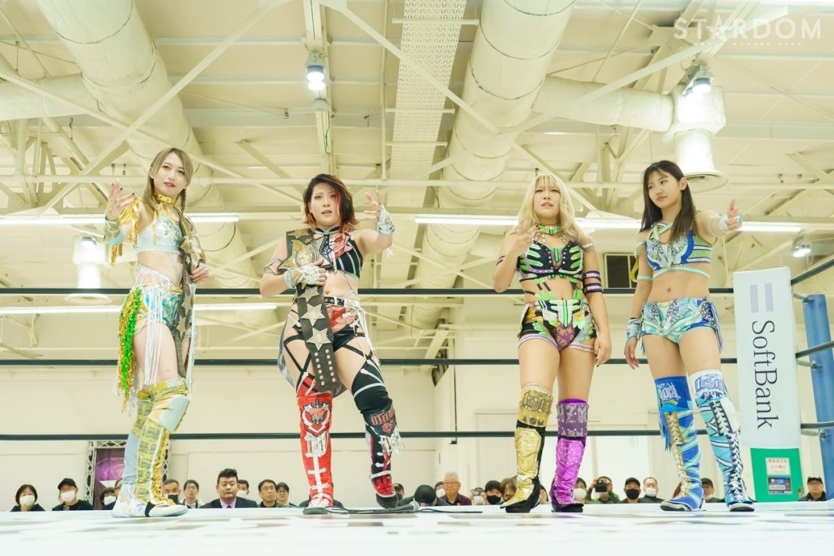 林下詩美&上谷沙弥&AZM&天咲光由組のクイーンズクエストとジュリア&舞華&桜井まい&テクラ組のドンナ・デル・モンドが8人タッグのイリミネーションマッチで全面対決。ゴッデス・オブ・スターダム王者の詩美&上谷組、アーティスト・オブ・スターダム王者のジュリア&桜井&テクラ組を擁する両ユニットのなかから勝ち残るのは?
