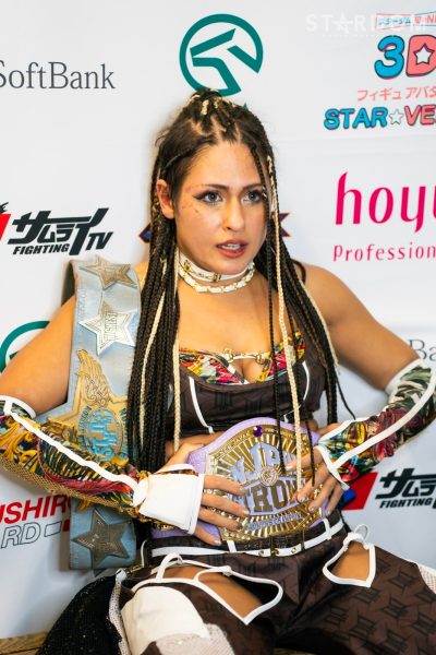 「えーとね、ダラスでケガして、表舞台に出るのが今日が初めてだったんですよ。約1カ月くらいかな、休業?休業というか欠場してて、なんかね久しぶりの表舞台はメチャクチャ緊張しました。もう心臓がドキドキしてプロレスラー岩谷麻優ってこういう感じだったんだって、すごい楽しくていまテンションすごく上がってるんですけど、イッテンヨンの防衛戦が朱里。メチャクチャ強いし怖いですよ、正直。正直赤いベルトも朱里に挑戦して取れなかったし5★STAR GPも朱里に負けてしまってるし、今回負けたらこのベルトを失ってしまう。メチャクチャ怖い1カ月ぶりの試合? 復帰は29日なのでイッテンヨンまでは2試合あるんですけど、コンディションがそこまで万全に…コンディションと言っても大丈夫なんですけども、1カ月休んでて相手が朱里か。強すぎるけど、強すぎる相手だから、燃えます。もう小指のケガとか1カ月ぶりの試合だとかそういうの抜きにバチバチに蹴ってもらって、バチバチに殴ってもらって、バチバチに投げてもらって、そこで私はいつも通り何度も何度も立ち上がってやり返して、最後にリングに立ってこのベルトをまた巻くだけなんで、必死に乗り越えたいと思います。久しぶりの試合、楽しみです。楽しみにしててね」