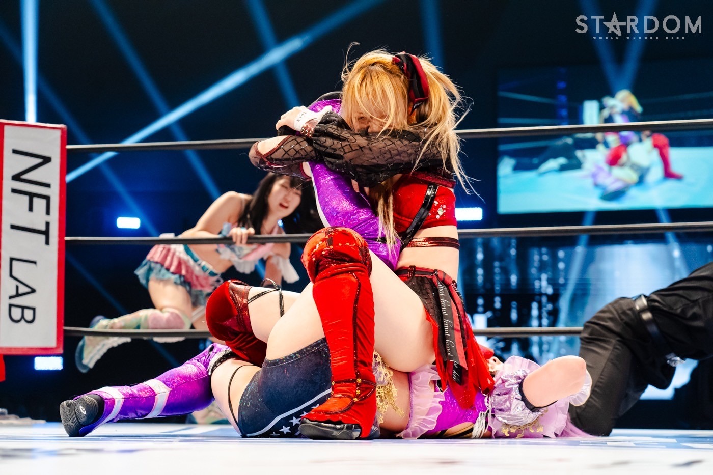 桃と琉悪夏がダブルで妃南を攻撃。妃南が琉悪夏に払い腰。琉悪夏がOTR狙いも妃南がこらえる。琉悪夏はエプロンに出してクロスボディー、妃南が転落し失格に。
