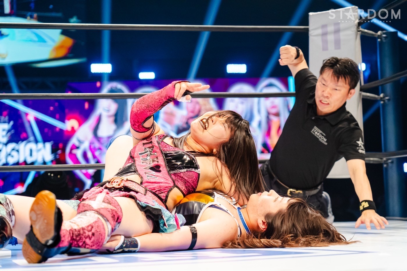 11分17秒、 グラマラスドライバーMINA→片エビ固め |