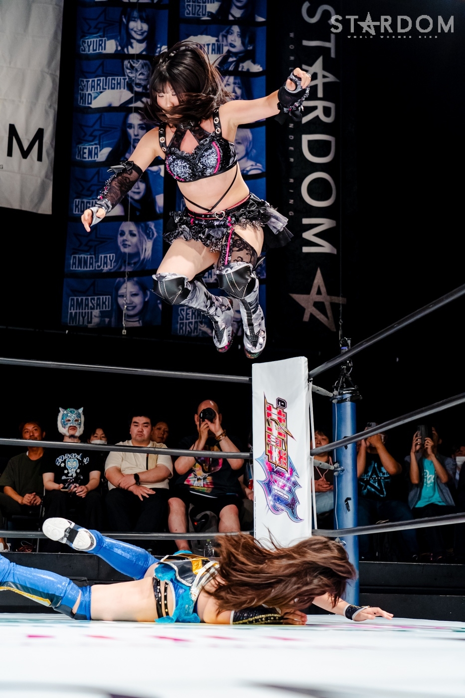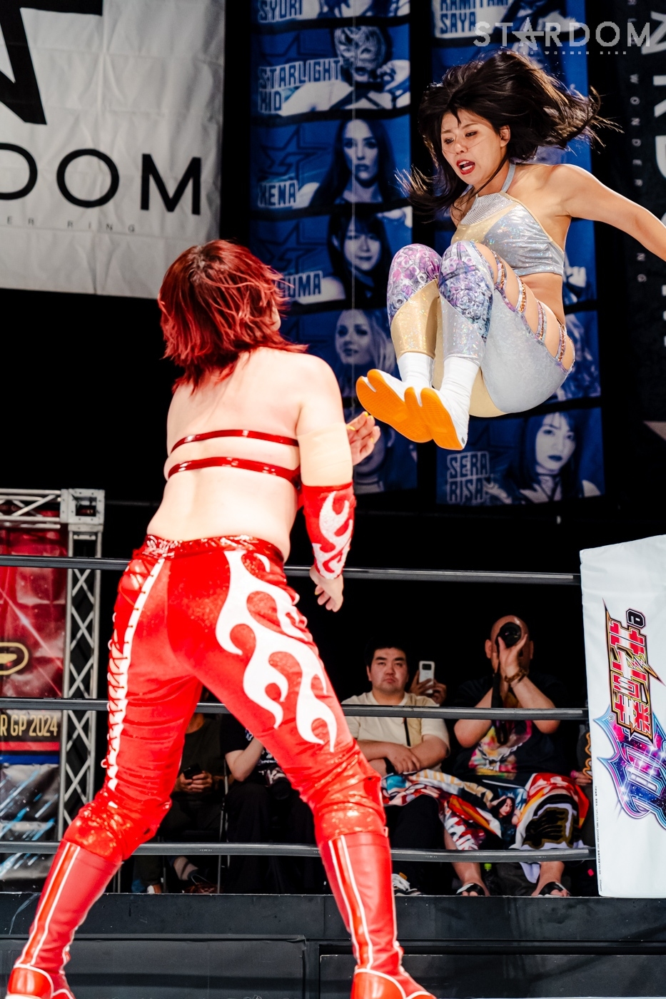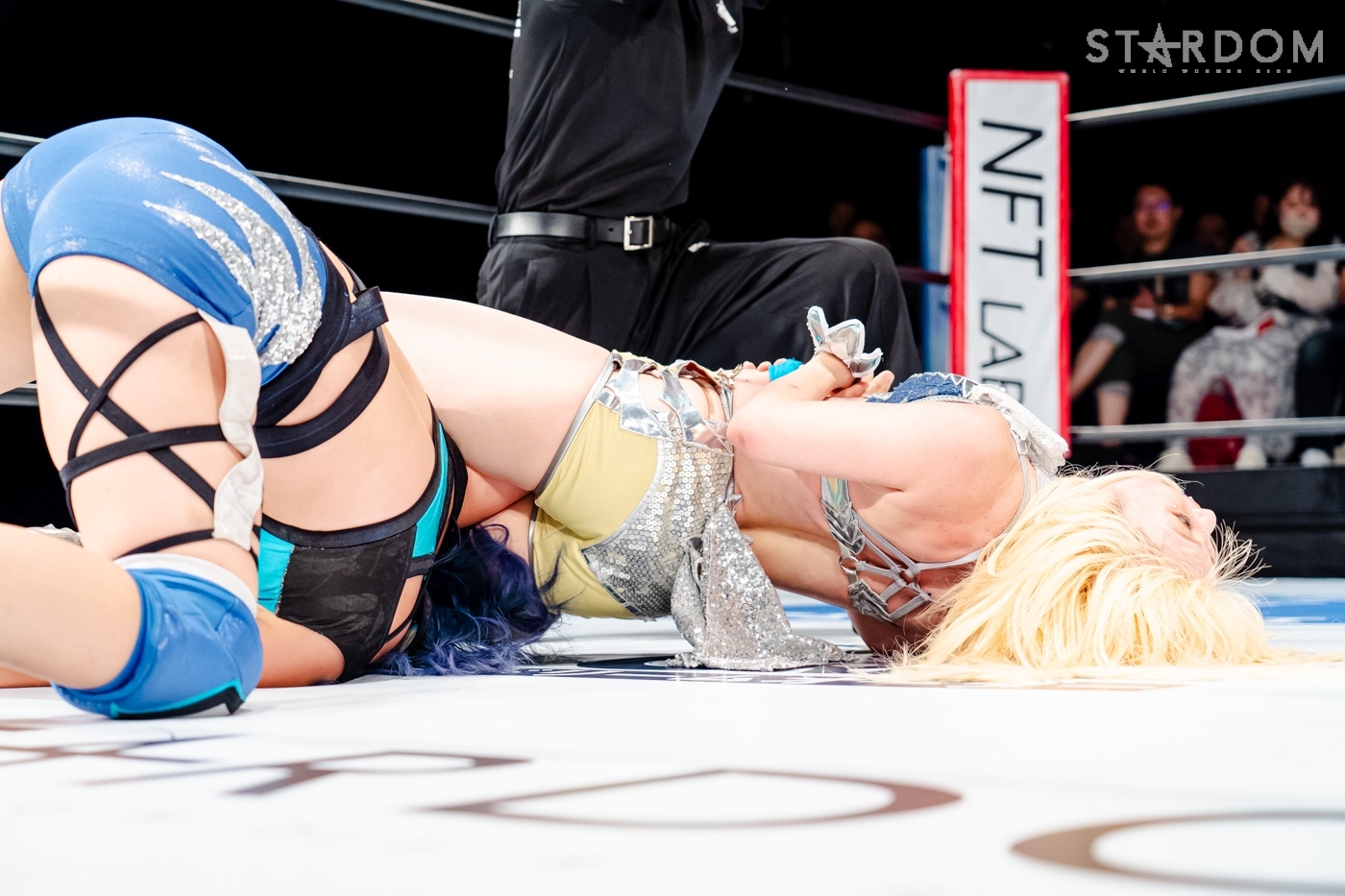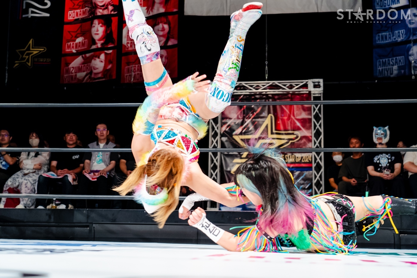 なつぽいから手を差し出し、愛海も応じる。ロックアップから愛海が押し込みエルボーを叩き込む。なつぽいがロープワークに誘いアームホイップ。愛海がドロップキックをかわしカバー。愛海がドロップキックを見舞い、ヘアーホイップで「フォー!」。なつぽいもやり返し[ポ~イ!]。愛海がもんきーフリップ、なつぽいがストンピング連打、背後からドロップキック、インディアンデスロックから腕を取る。愛海がエスケープすると、なつぽいがアームブリーカー、顔面を踏みつけるとボディースラム。返した愛海がニーアタック、フライングクロスチョップ、ドロップキック。愛海の突進を読んだなつぽいがクロスボディー、腕十字。愛海がエスケープすると、なつぽいがドロップキック狙い。愛海がロープを引いて阻止、エプロンに出してドロップキック、場外へエプロンからミサイルキック。「まだまだいくぞ!」と場外でドロップキック。リングに戻し、ミサイルキック。しかし、なつぽいが肩を上げる。愛海がノーザン狙い。なつぽいが切り返しネックブリーカー、ジャックナイフ。愛海が反転し、逆エビ固め。なつぽいがエスケープすると、愛海がコーナーへ。なつぽいも上がると愛海がバックドロップ、ダイビングボディープレス。なつぽいがかわして、ダイビングボディーアタック。カバーを愛海が反転、返したなつぽいがヘッドシザーズから腕を取る。10分経過。愛海の足がロープへ。なつぽいが腕を蹴り上げ、ドロップキック。「まだ!」と叫んで突進すると愛海がカウンターでジャンピングニー。なつぽいがダッシュするが愛海がニー。なつぽいがトラースキック、ポイ捨てジャーマン。残り3分。なつぽいがフィニッシュを宣言し、フェアリングリング狙い。愛海が切り返し丸め込む。返したなつぽいがバックラッシュから腕を取る。腕十字が決まると愛海がギブアップした。