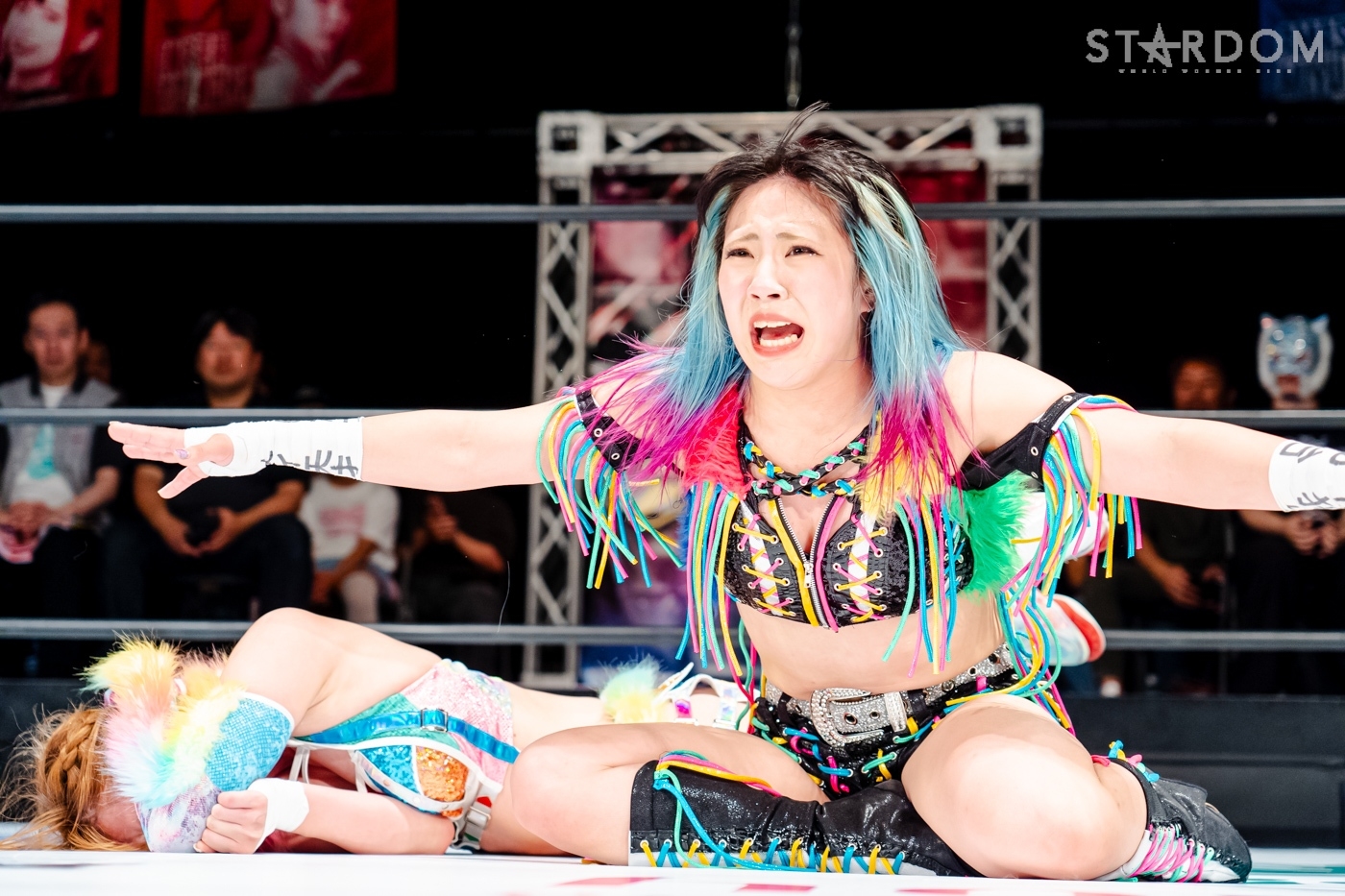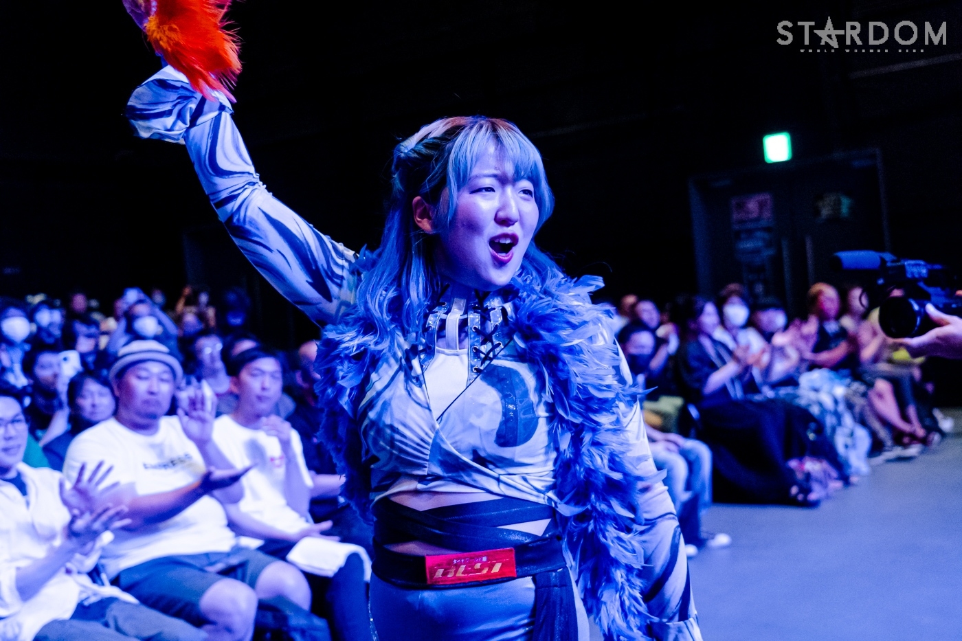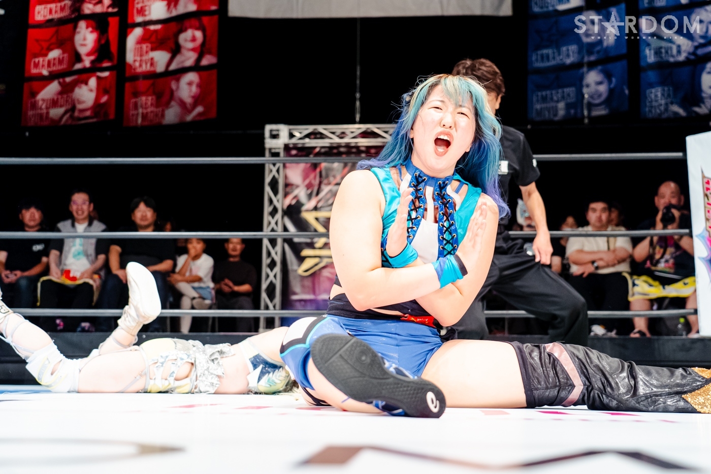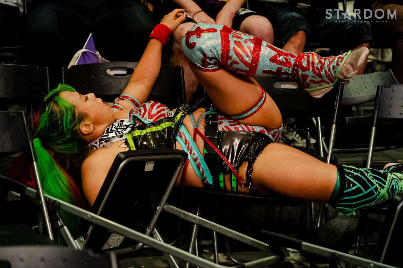 新宿で、このままいけば私1位通過だから、レッドスターズBの2位の人とやるのかな?わからないけど。そこでも勝って、31日武蔵野の森、両方勝ってスターダム初の全勝優勝者に必ず私がなります。清々しく今年こそは私の夏にして見せたいと思います。以上です。あ~疲れた」